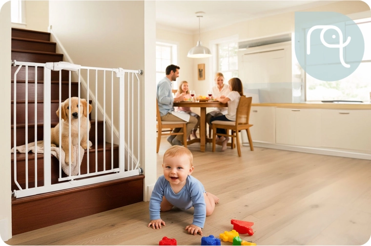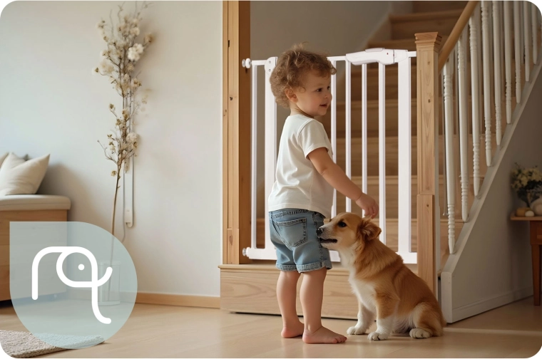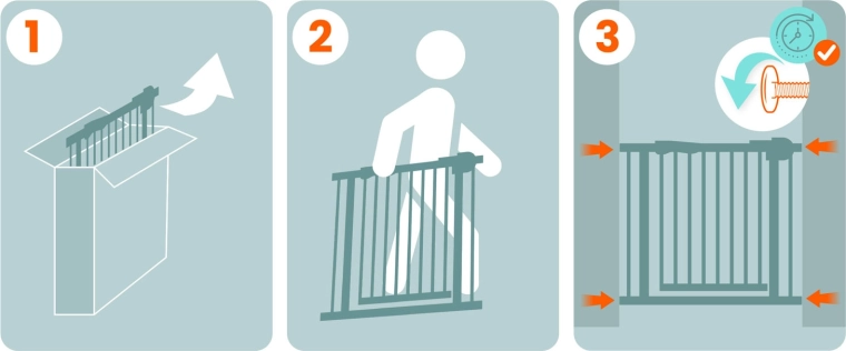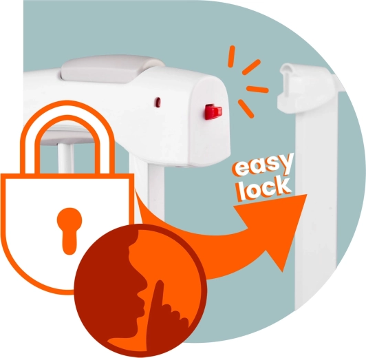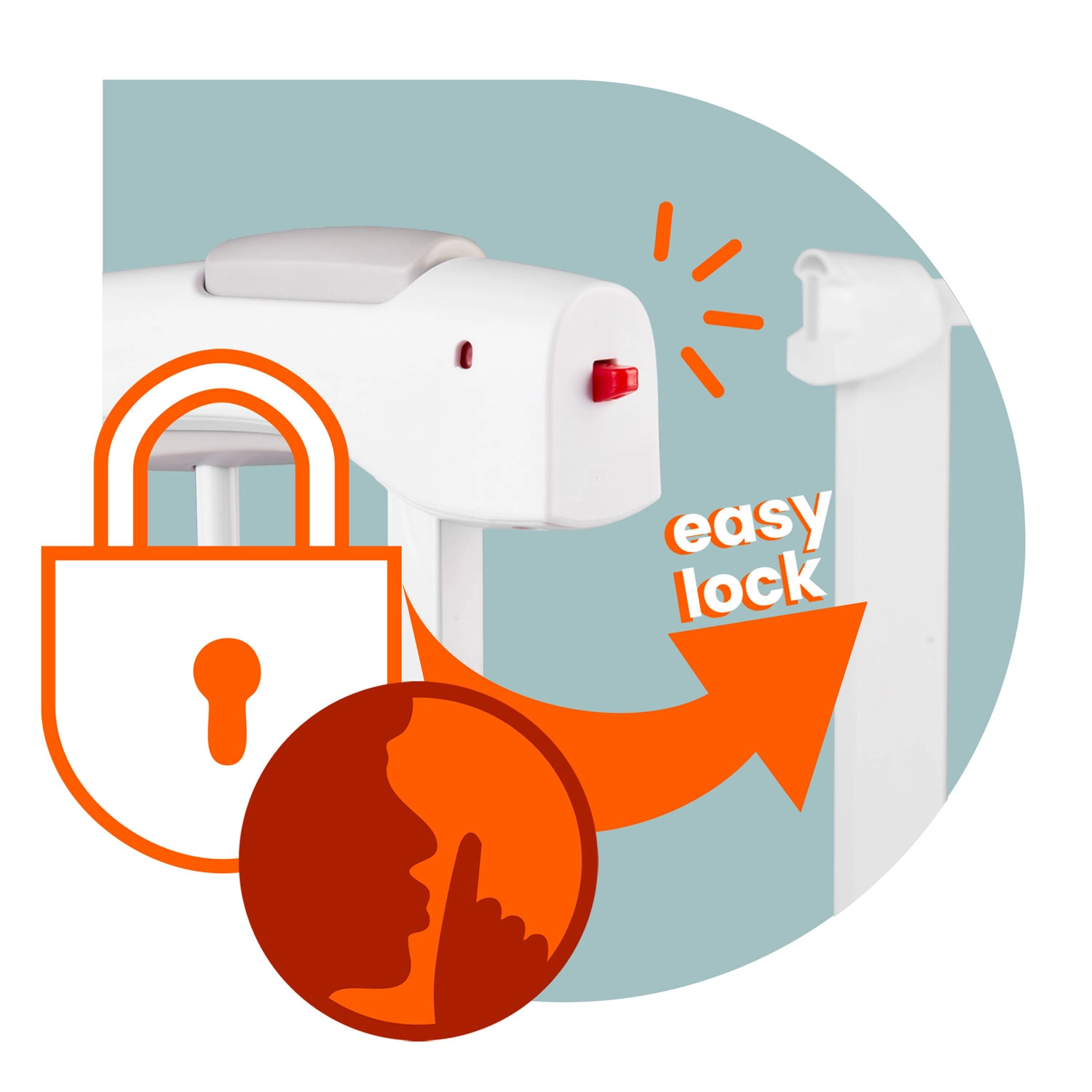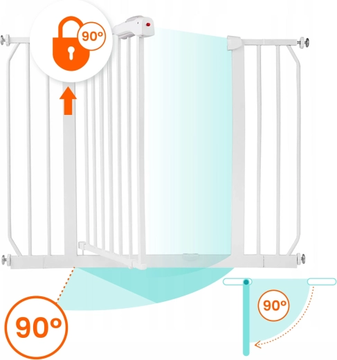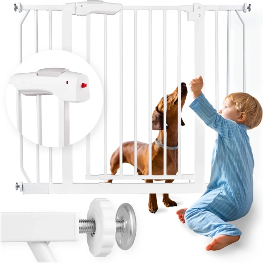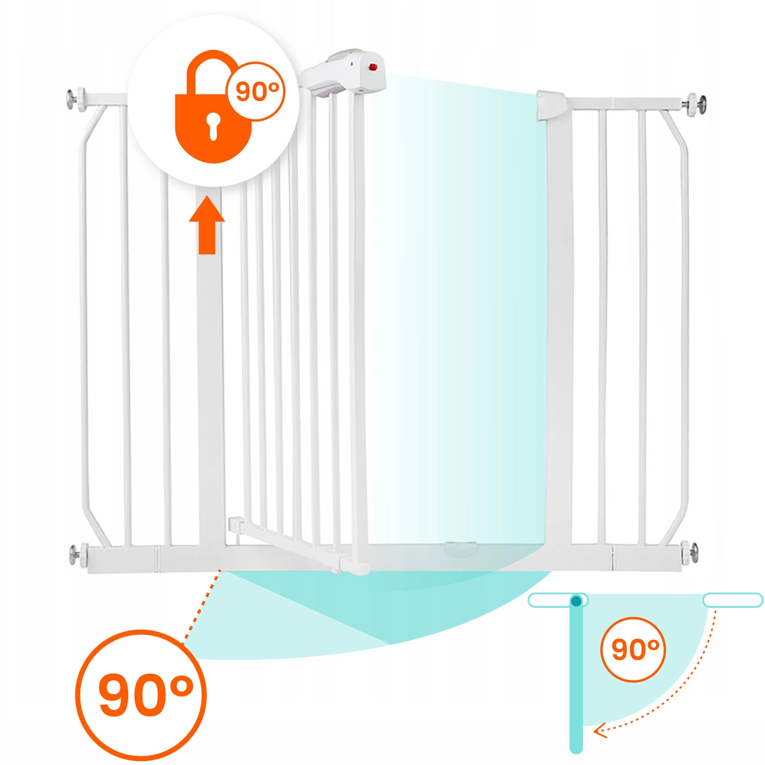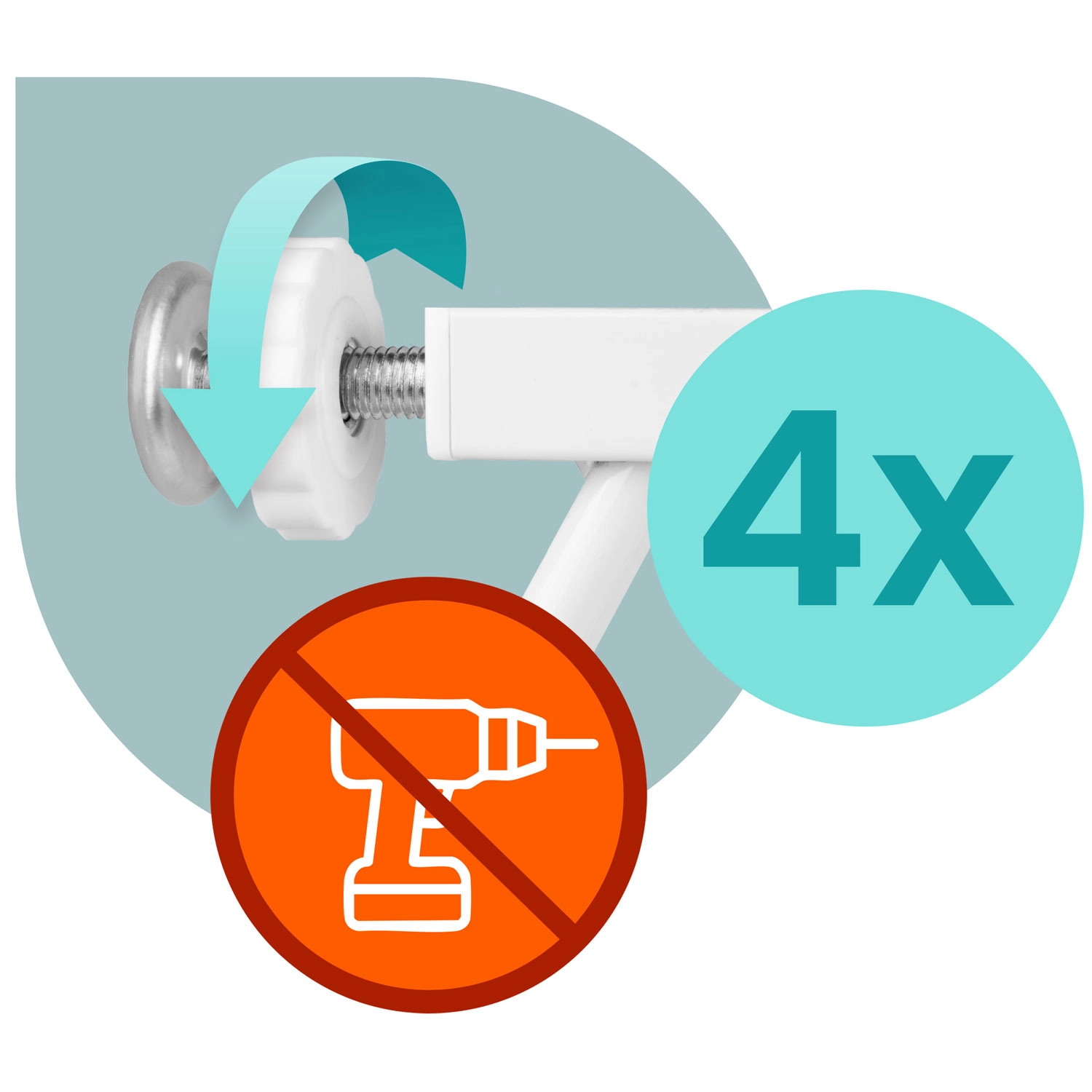 Pachetul include extensii și reglatoare de lățime, datorită cărora ajustați cu ușurință bariera pentru deschideri de 75–105 cm. Ideală pentru uși și pentru începutul sau capătul scărilor.