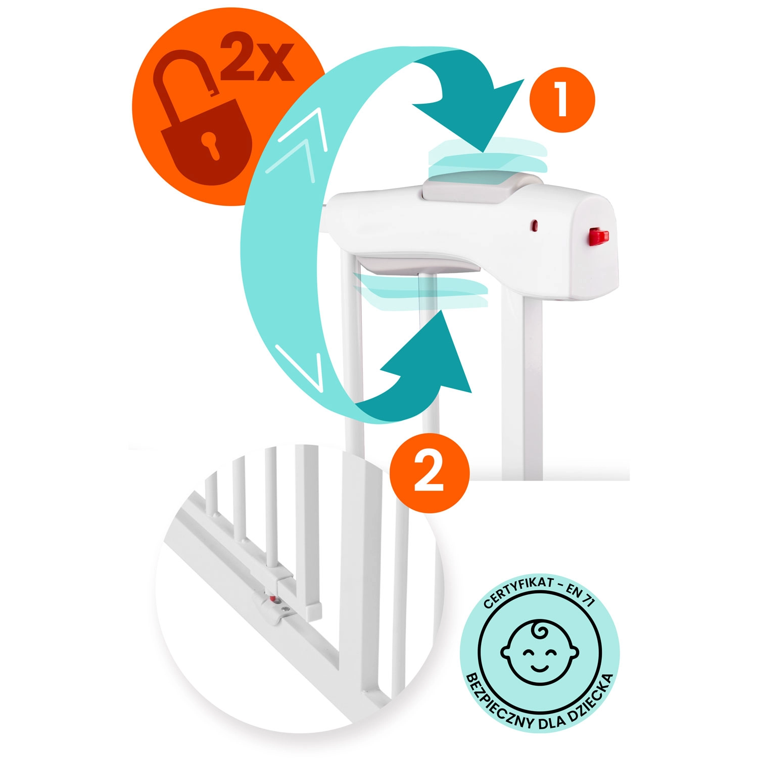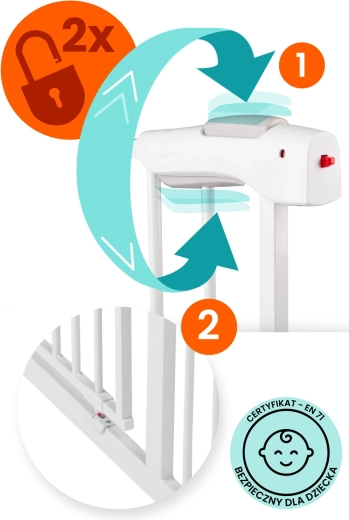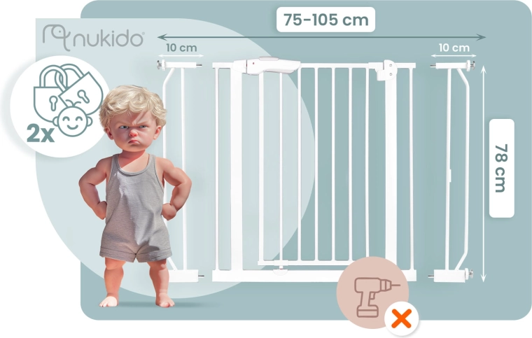 Bariera de siguranță NUKIDO, în elegantul alb, se potrivește majorității interioarelor și, datorită fixării prin presiune, se instalează în câteva minute – fără a deteriora pereții sau tocurile. Construcția metalică robustă și certificarea EN 1930:2011 asigură protecție de încredere pentru copii și animalele de companie mai mici.
