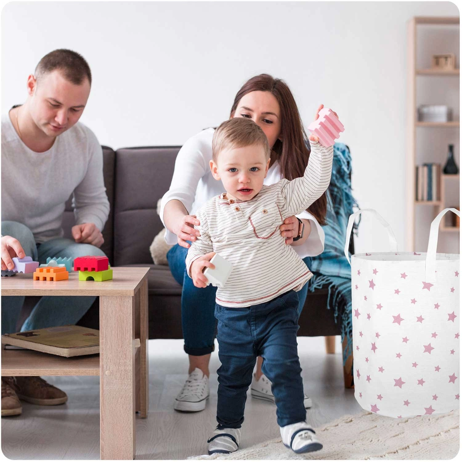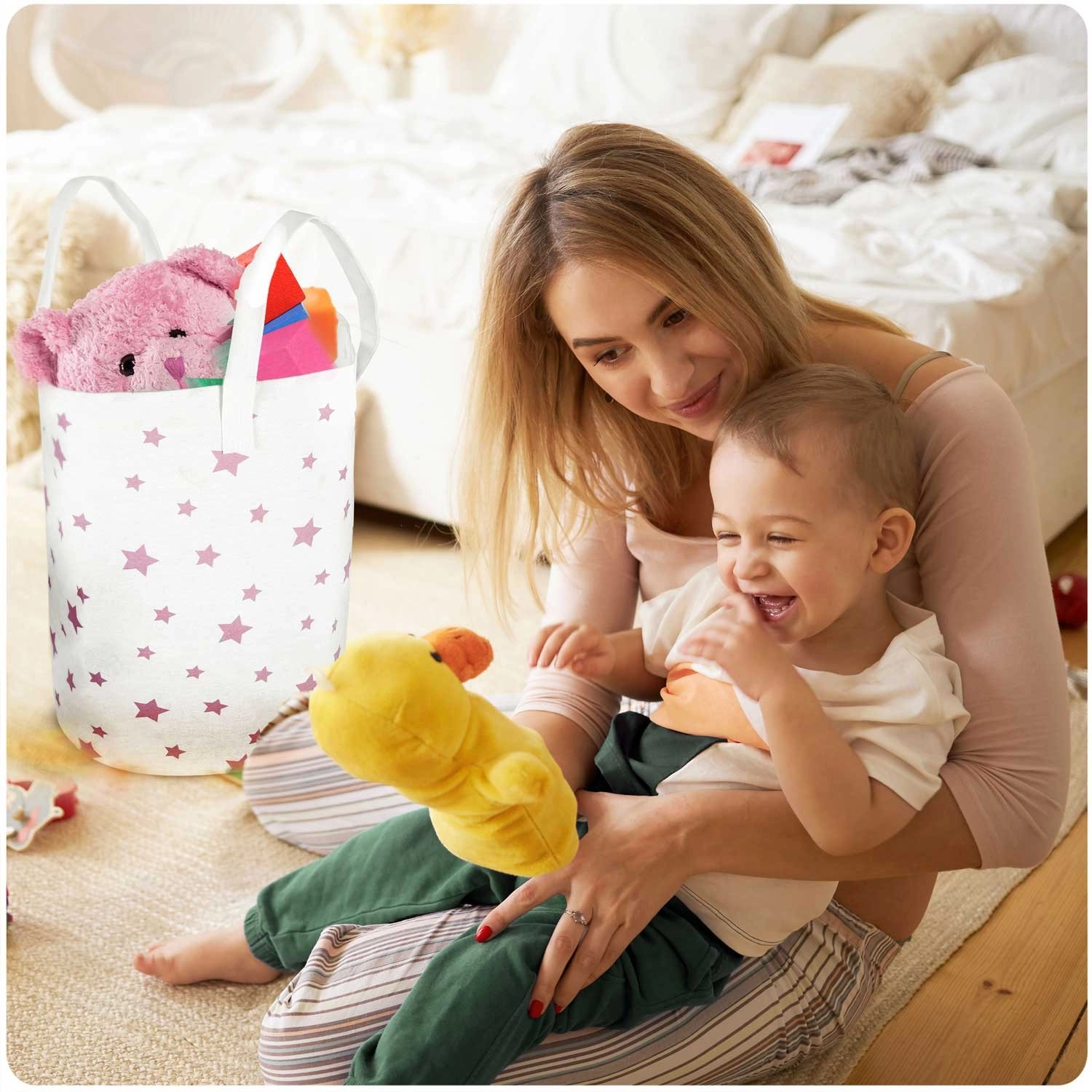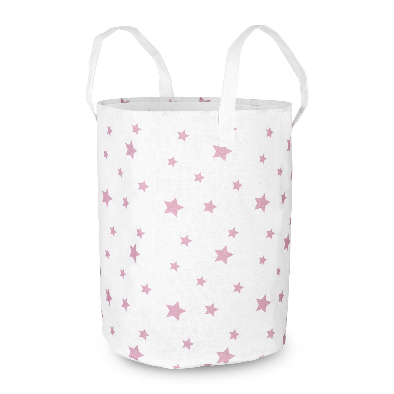 Coșul textil mare și ușor pentru jucării Nukido, în culoare albă cu steluțe roz, ajută la menținerea ordinii în camera copilului. Datorită capacității mari, mânerelelor cusute rezistent și întreținerii ușoare, este ideal pentru jucării, rufe și mărunțișuri. Materialul din bumbac este plăcut și în același timp rezistent, iar coșul este pliabil și portabil pentru utilizare zilnică.