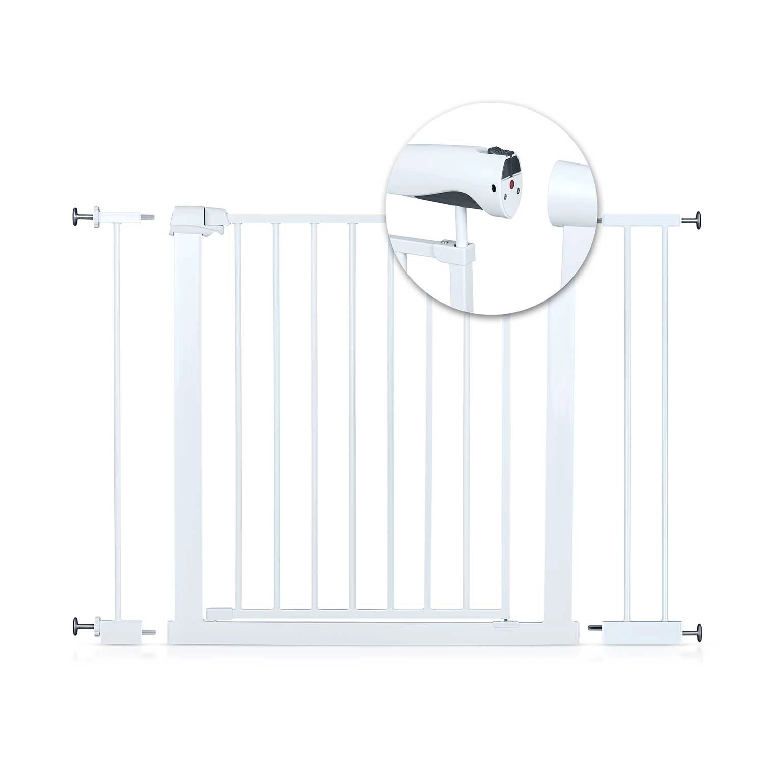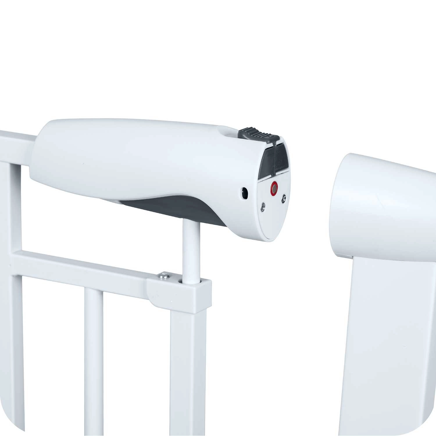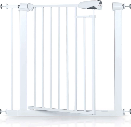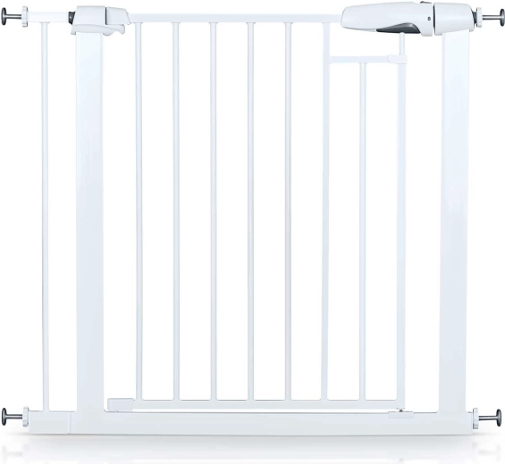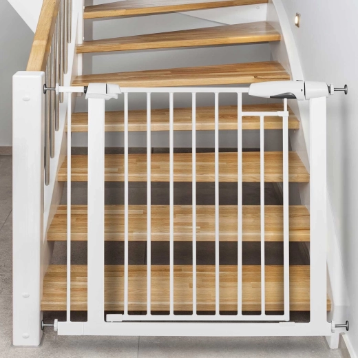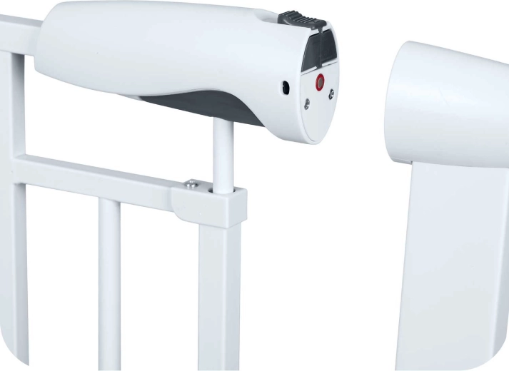 Poarta de siguranță NUKIDO protejează copiii și animalele de companie de accesul la scări sau în zone periculoase. Se montează fără găurire prin sistem de presiune, are structură metalică albă și închidere magnetică cu posibilitatea de deschidere cu o singură mână. Datorită intervalului reglabil 76–104 cm, se potrivește perfect în uși și treceri.