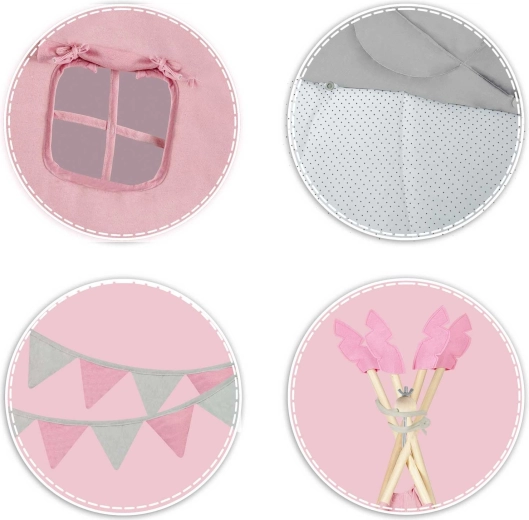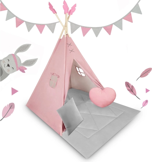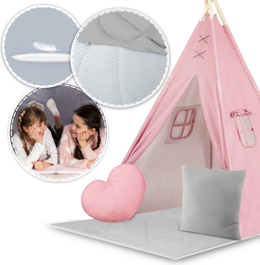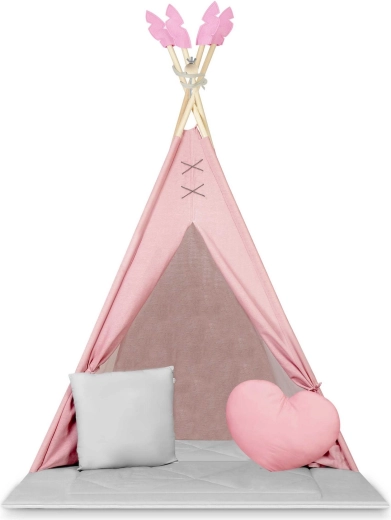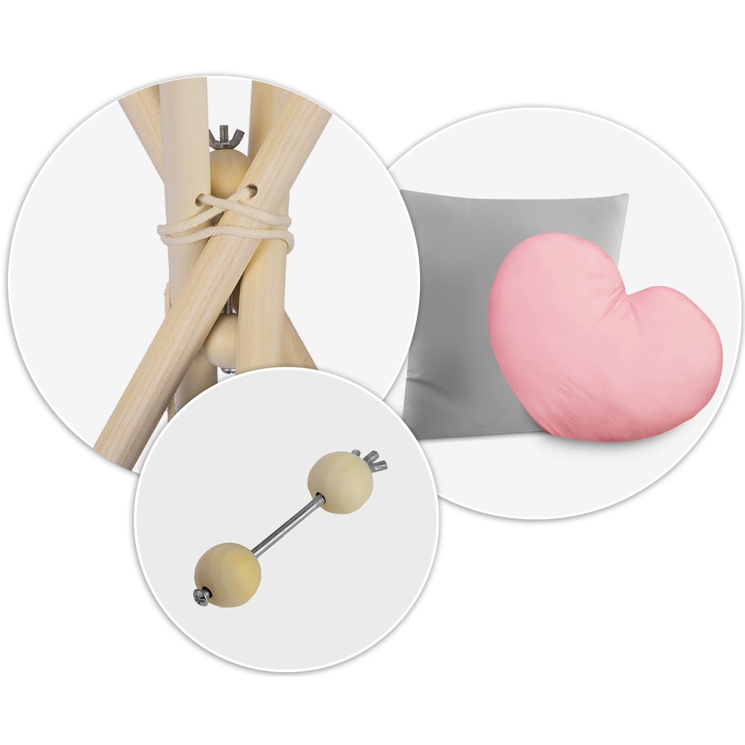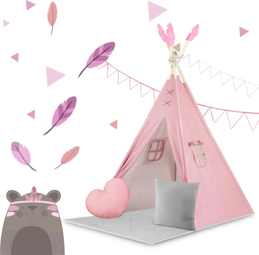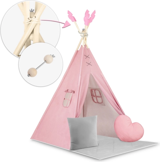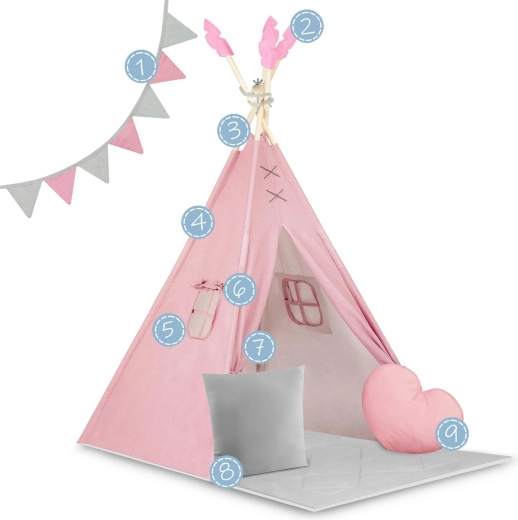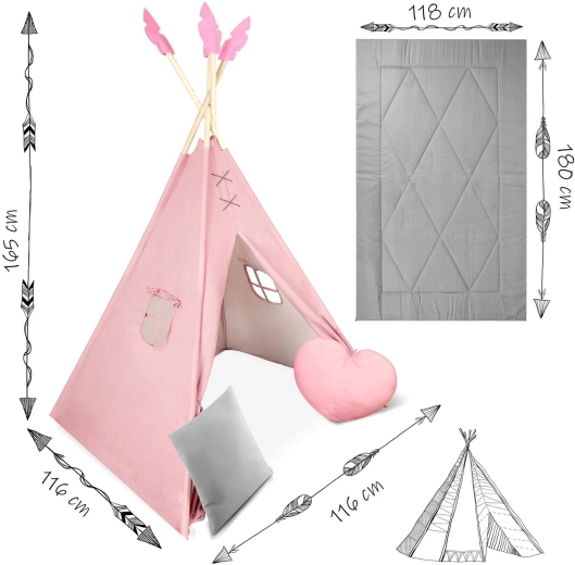Pachetul conține o saltea izolantă deosebit de groasă cu puncte antiderapante pentru confort și siguranță pe orice tip de podea. Două perne (inimă + pătrat), o ghirlandă și pene decorative completează atmosfera magică a regatului copiilor. Stabilizatorul inclus gratuit ajută la menținerea teepee-ului ferm pe loc și facilitează mutarea prin cameră.