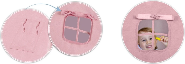 Stabilizatorul inclus crește siguranța construcției și permite mutarea ușoară a teepee-ului. Fereastra cu roletă și bride îmbunătățește circulația aerului și vizibilitatea asupra copiilor.