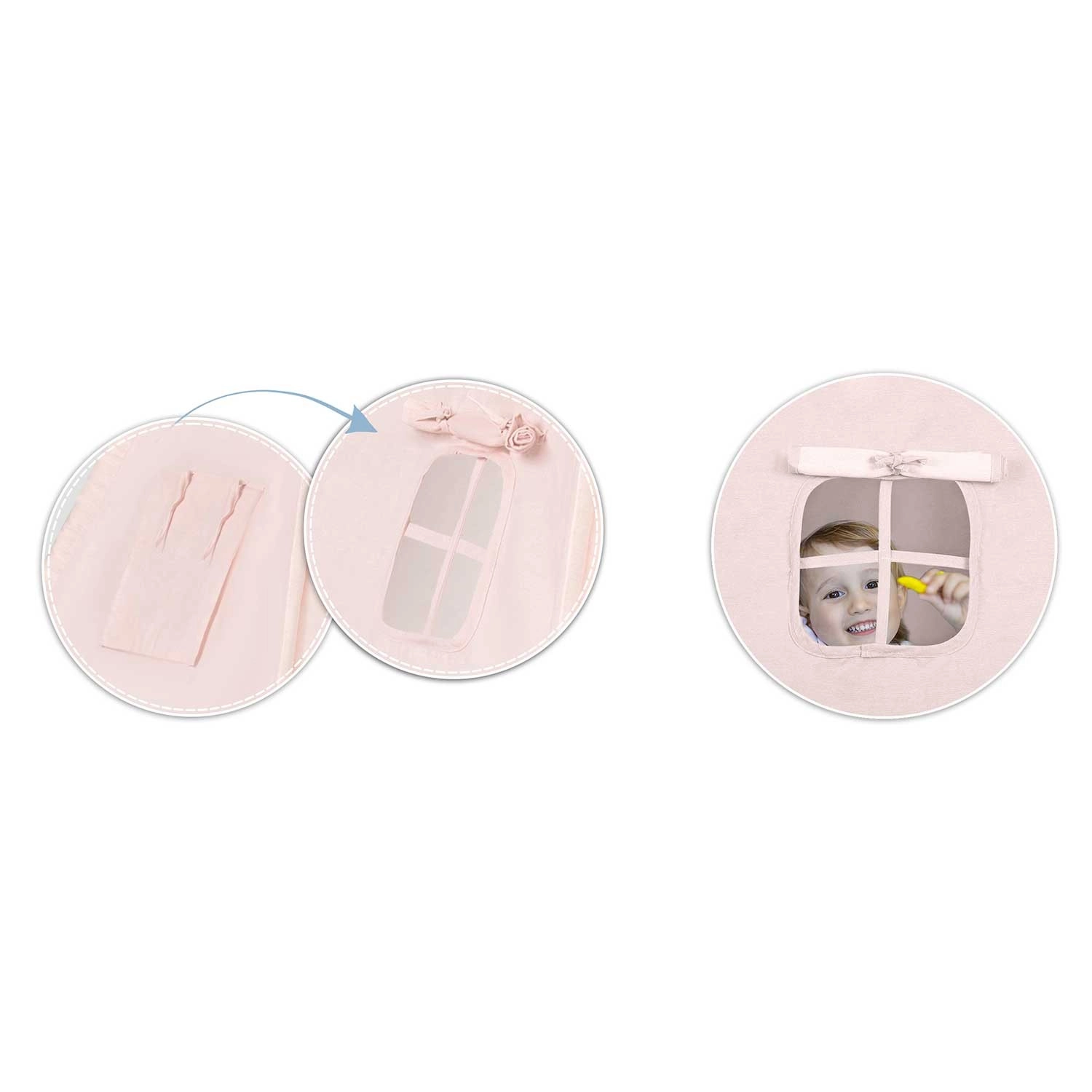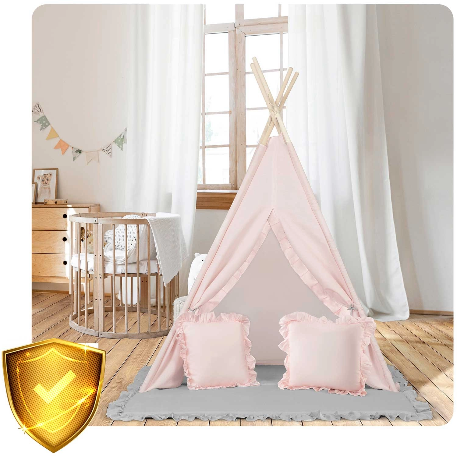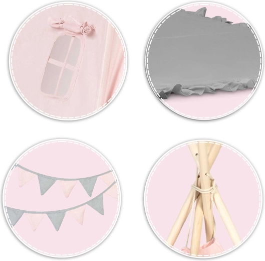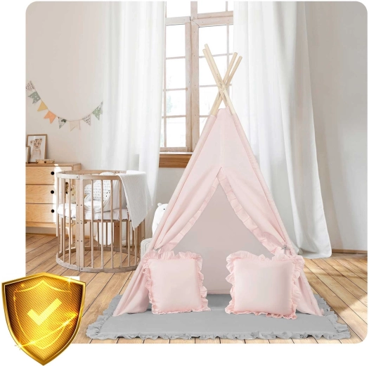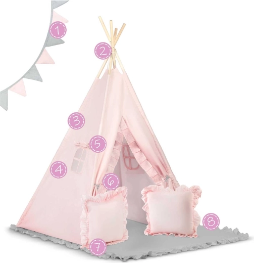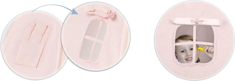 Setul include o saltea izolatoare extra groasă, cu elemente antiderapante pentru ședere moale și călduroasă, precum și două pernuțe (pătrat și inimă) pentru un plus de confort. Fereastra cu rulou care se poate deschide stimulează imaginația și contactul cu părinții, în timp ce ghirlanda și detaliile decorative oferă un ambient primitor.