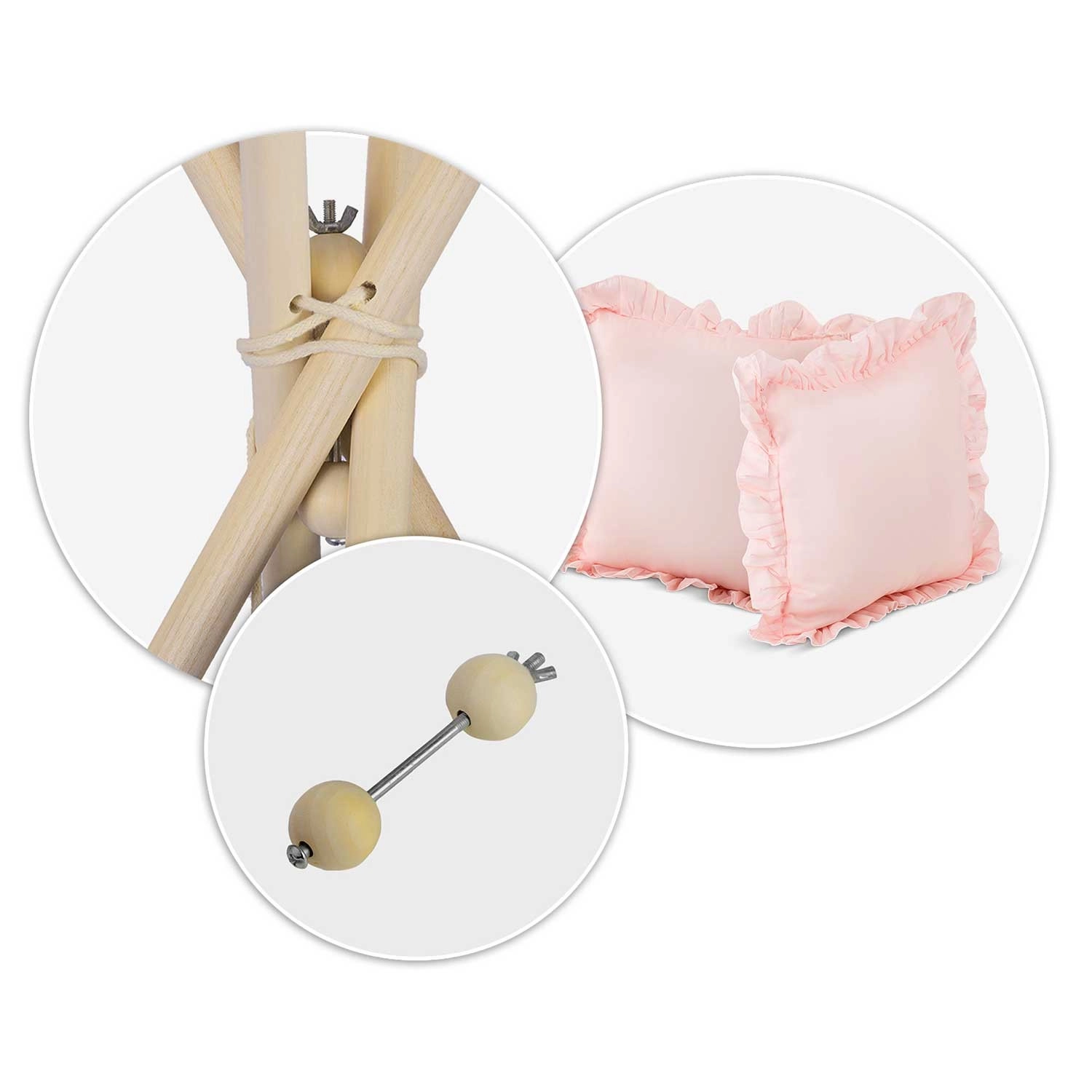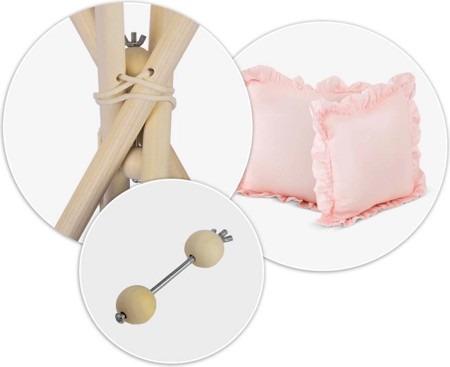 Patru bețe din pin și stabilizatorul inclus asigură robustețe și siguranță. Montaj și mutare ușoare, atât în casă, cât și pe terasă.