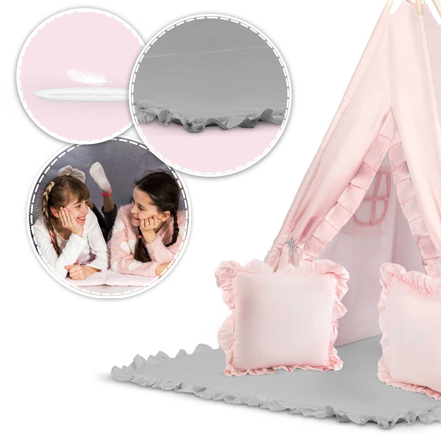 Salteaua groasă izolatoare cu elemente antiderapante și cele două pernuțe pufoase (pătrat și inimă) creează un colț primitor pentru joacă și relaxare.
