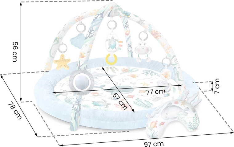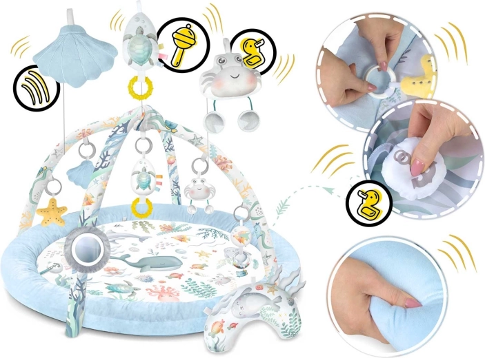 Oglindă, zornăitori, figurine plușate moi și crab cu pârâitoare stimulează văzul, auzul și simțul tactil. Jucăriile pot fi mutate liber pe arcade și pe margini.