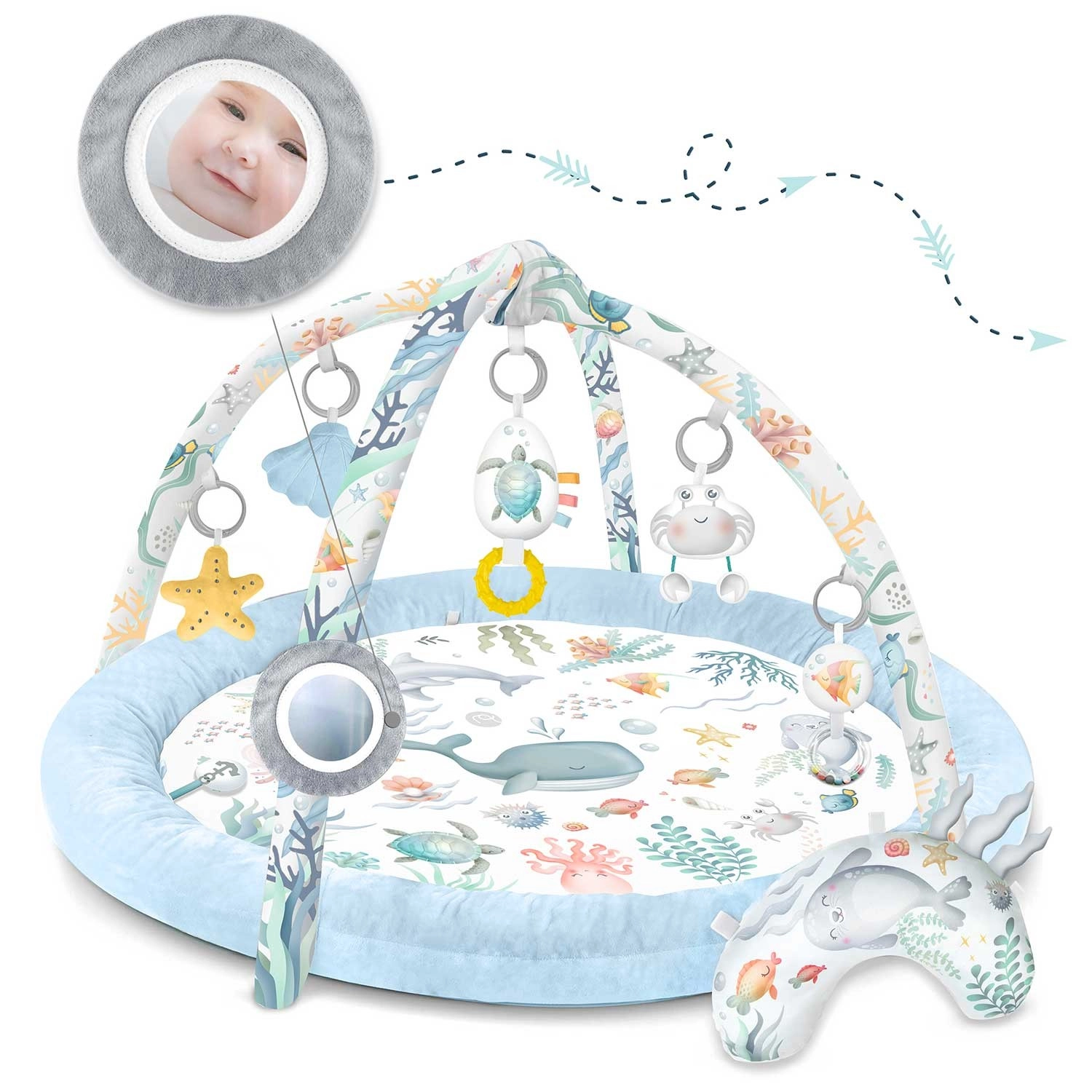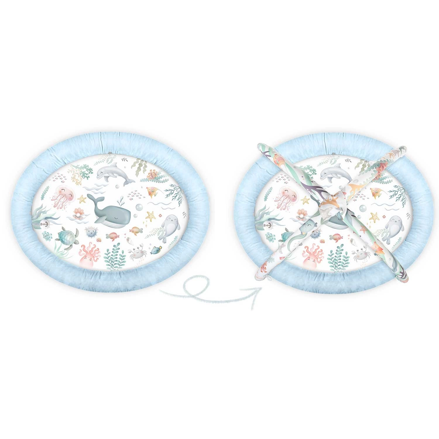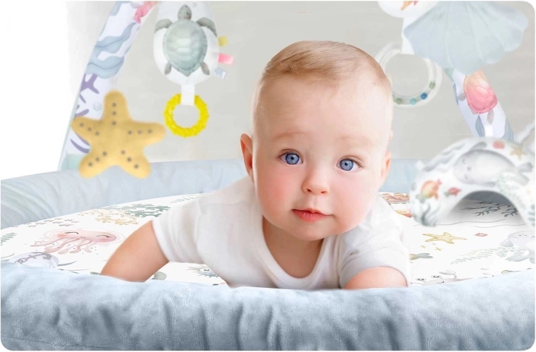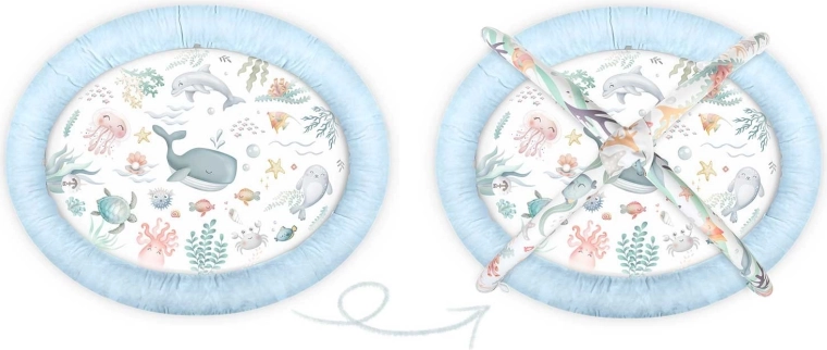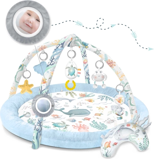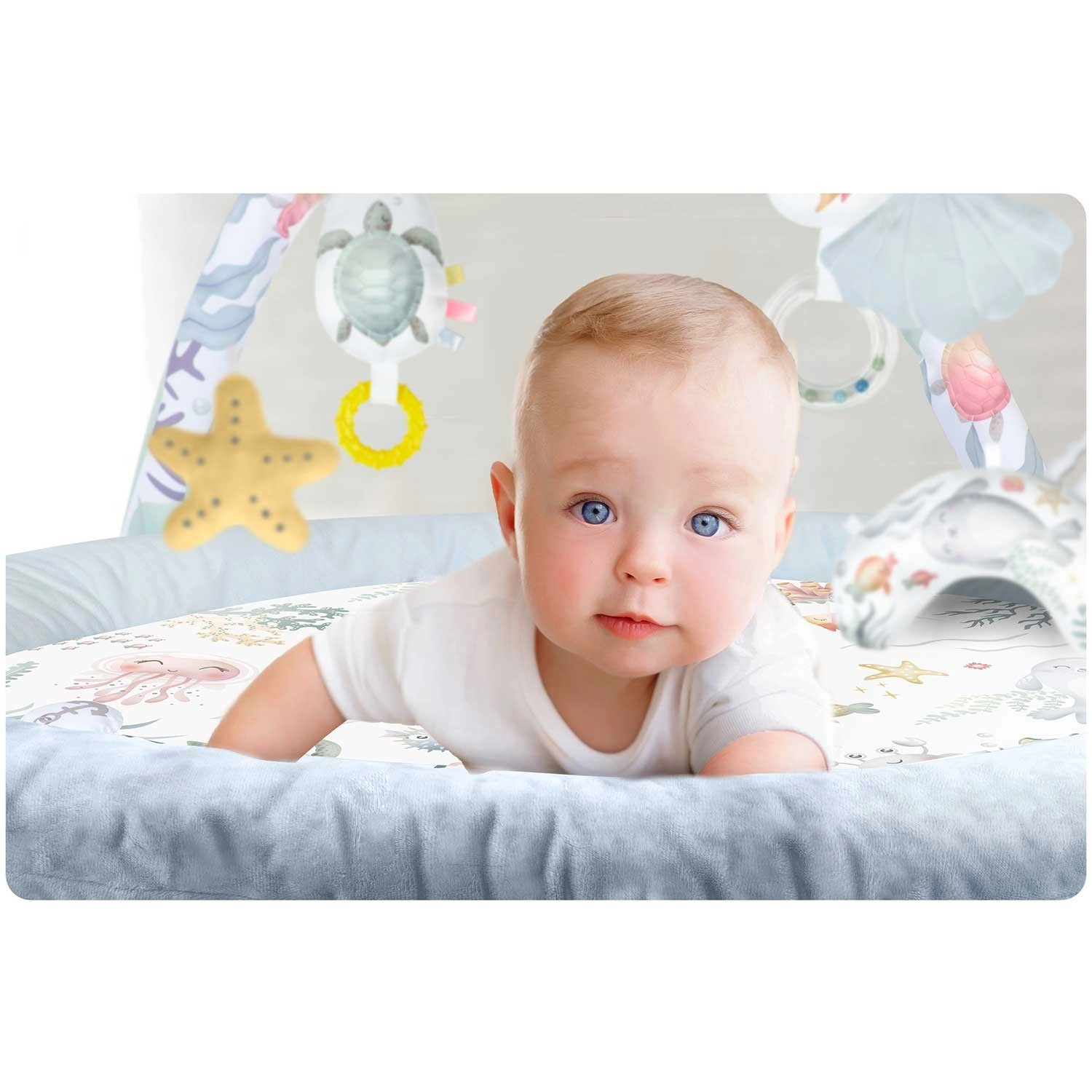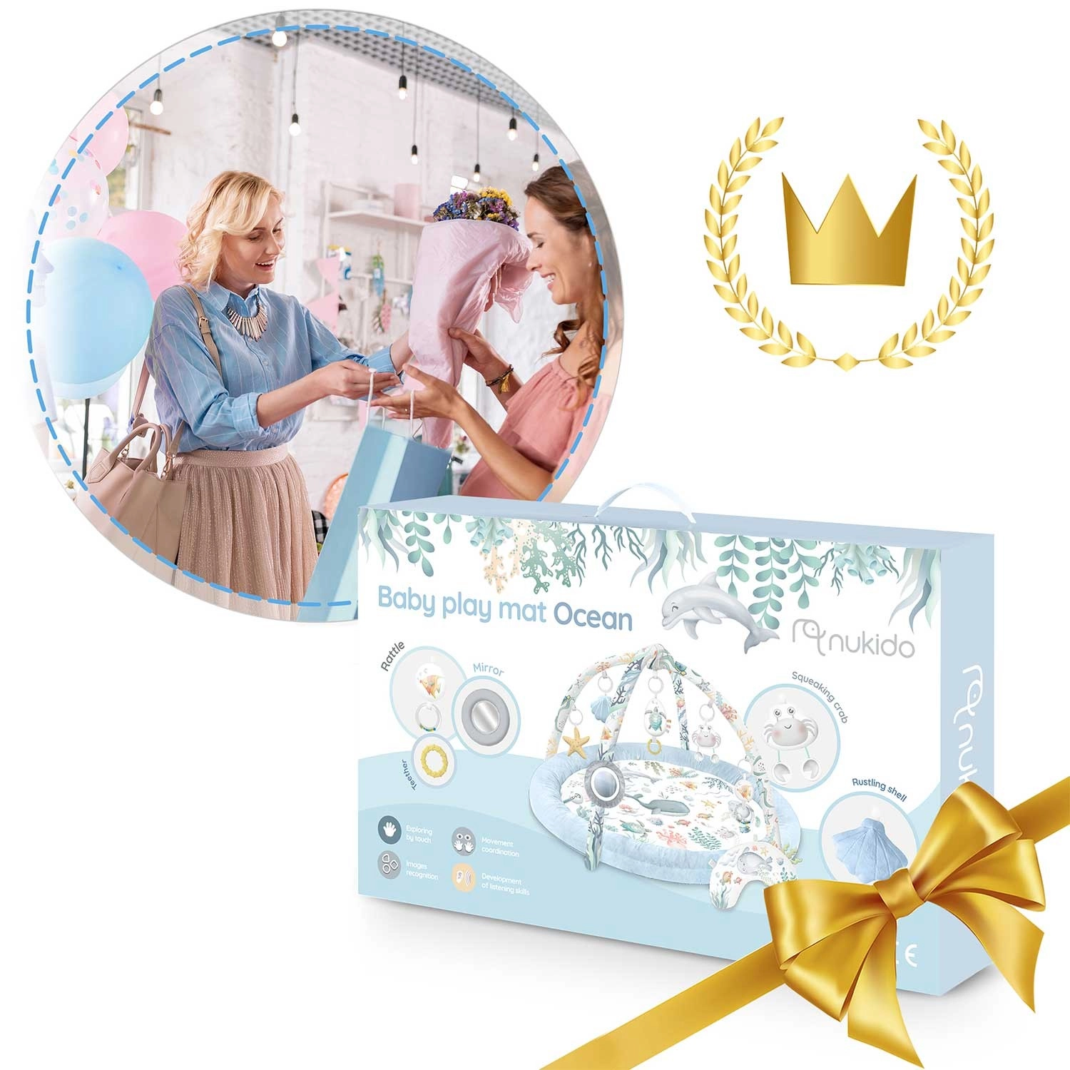 Covorașul de joacă Nukido Ocean creează un mediu primitor și sigur pentru nou-născuți și bebeluși mai mari. Două arcade încrucișate susțin jucării detașabile care dezvoltă văzul, simțul tactil și auzul – de la oglindă pentru autocunoaștere la zornăitori, elemente foșnitoare și crab cu pârâitoare. Este inclusă și o perniță moale pentru joacă confortabilă pe burtică.