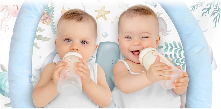 - Susținerea motricității: jucării suspendate pentru exersarea prinderii și coordonării mână–ochi, perniță pentru o poziție sănătoasă pe burtică.