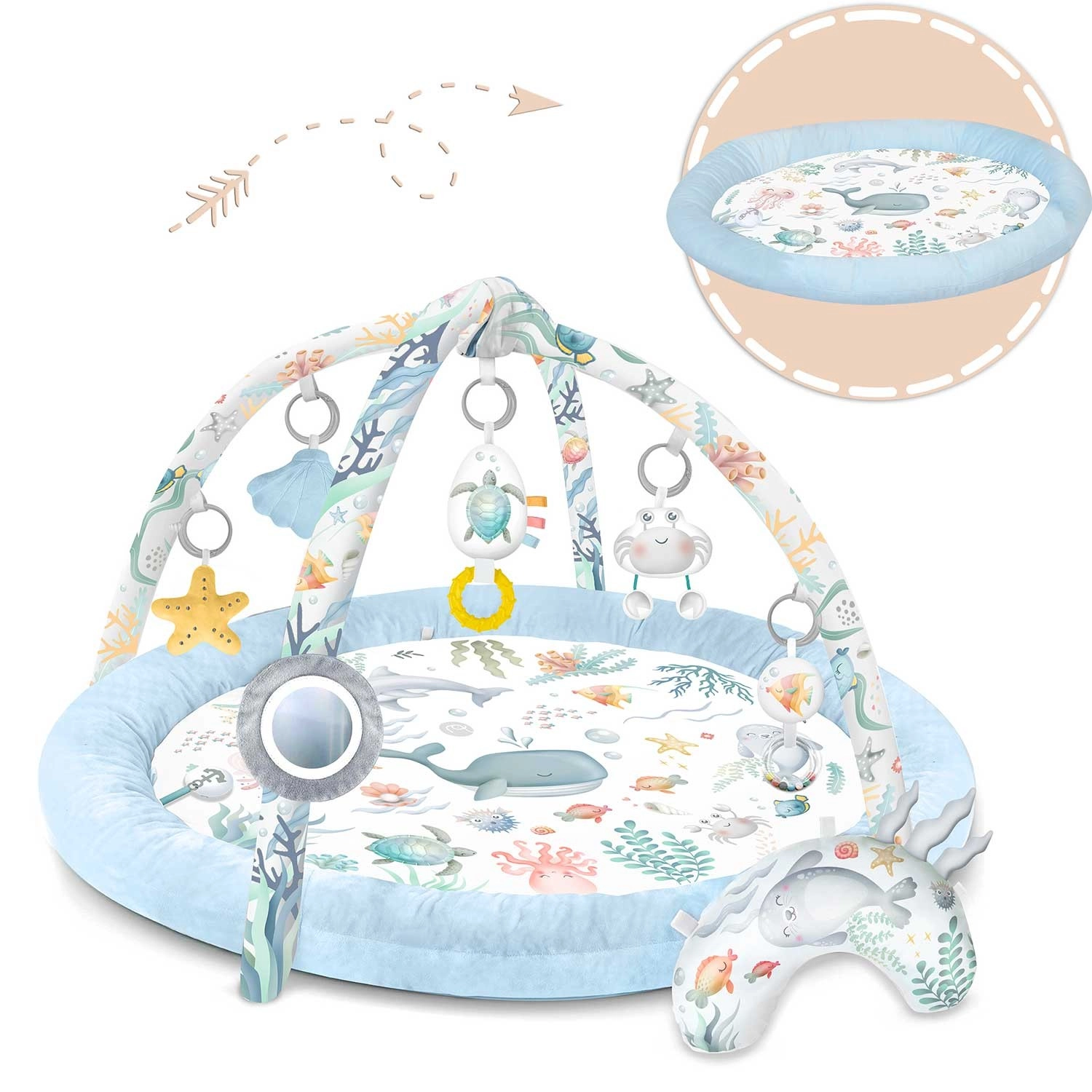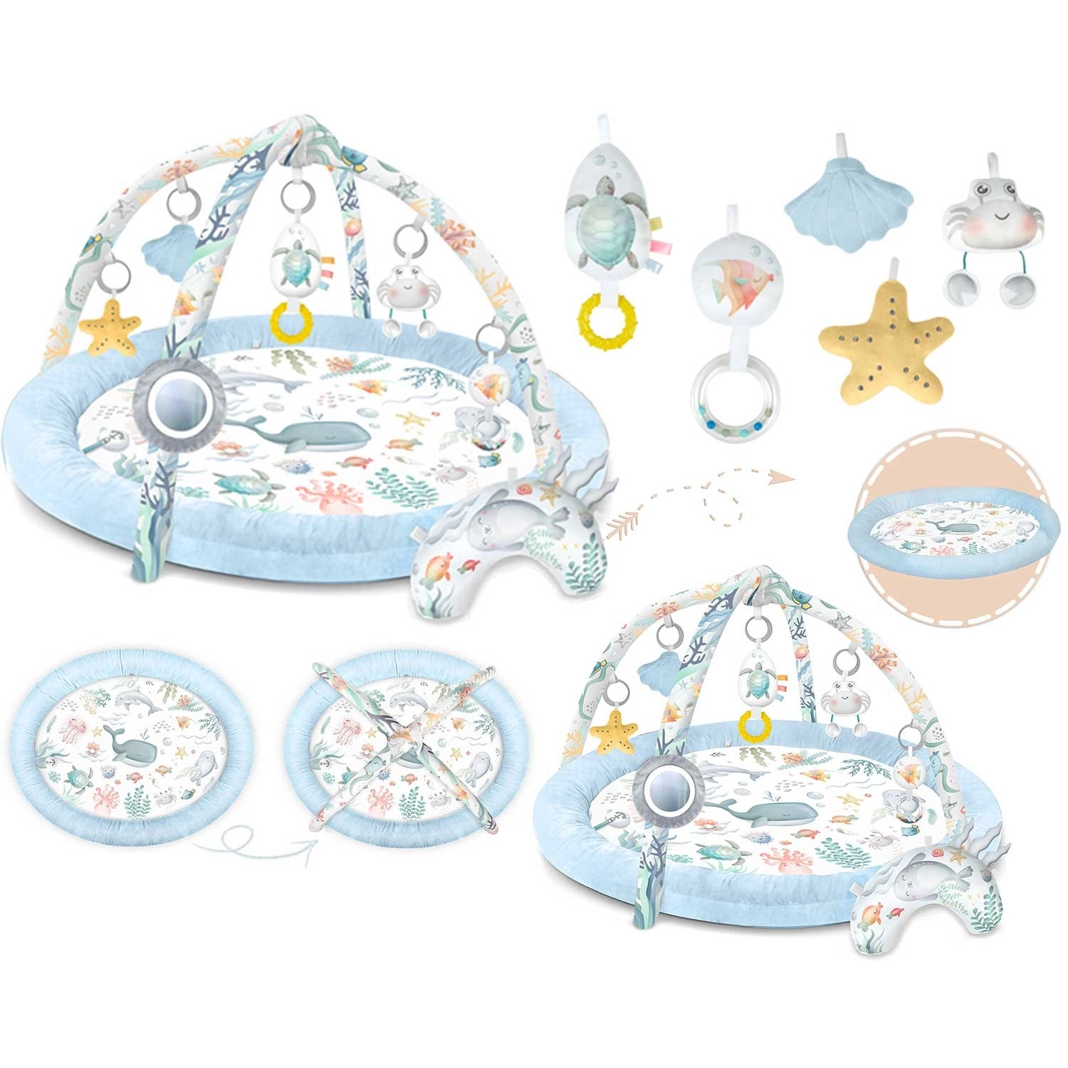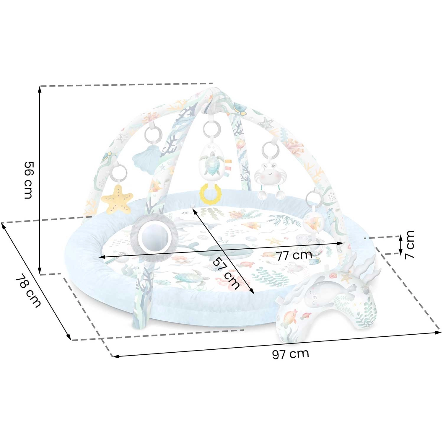 - Covoraș de joacă cu margine ridicată, 2 arcade detașabile, 7 jucării multifuncționale, perniță