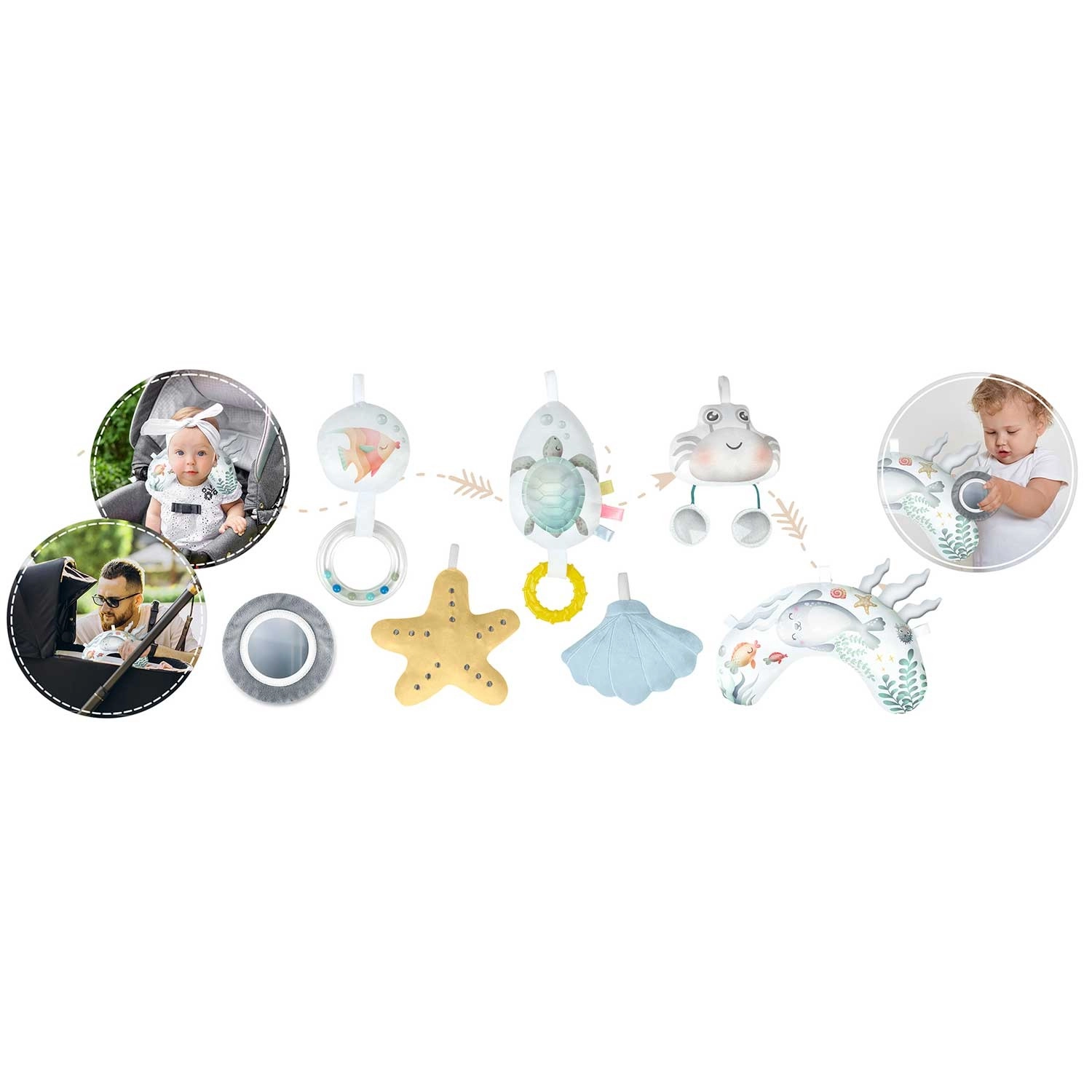 - Oglindă, zornăitori, elemente foșnitoare, jucărie cu pârâitoare (crab), figurine suspendate moi