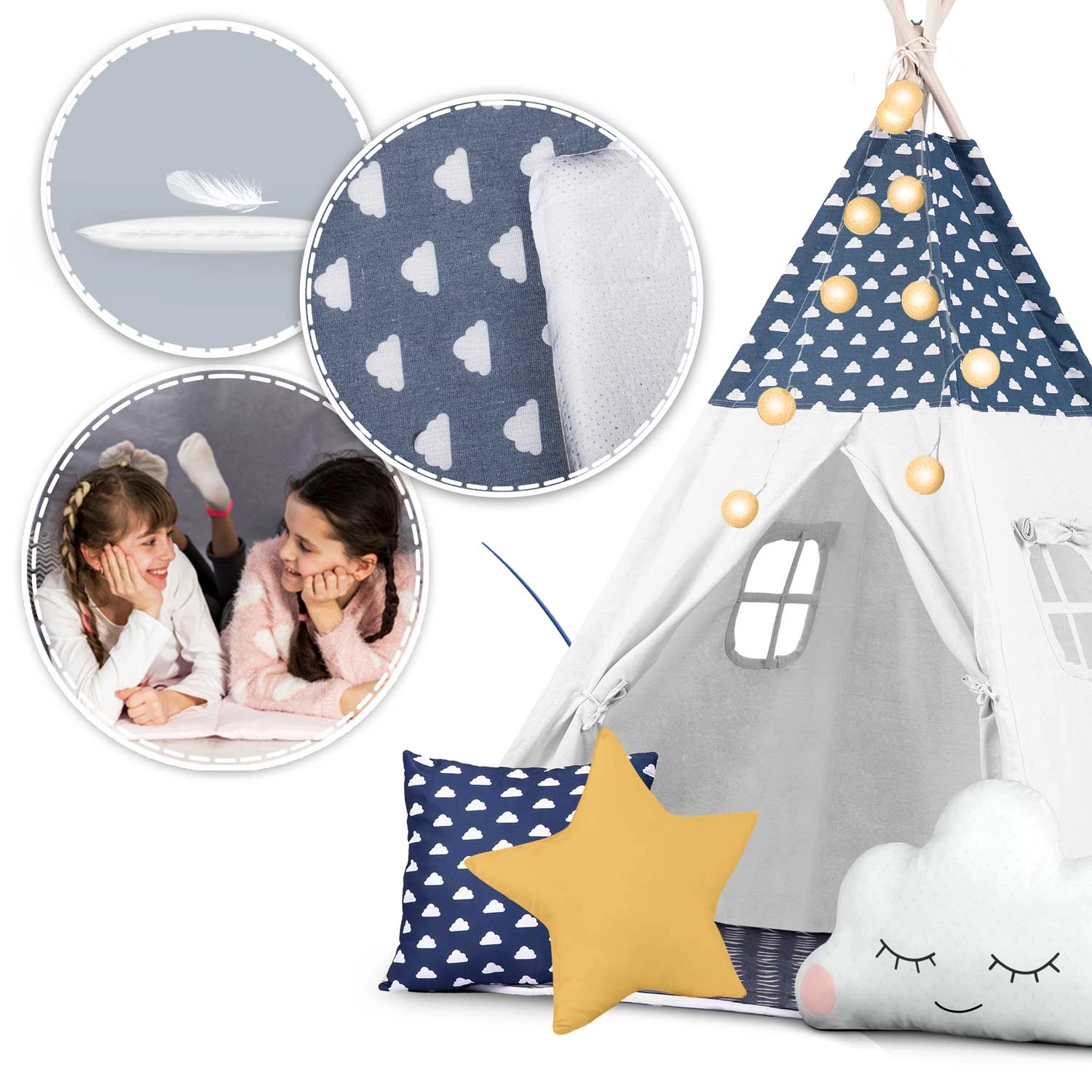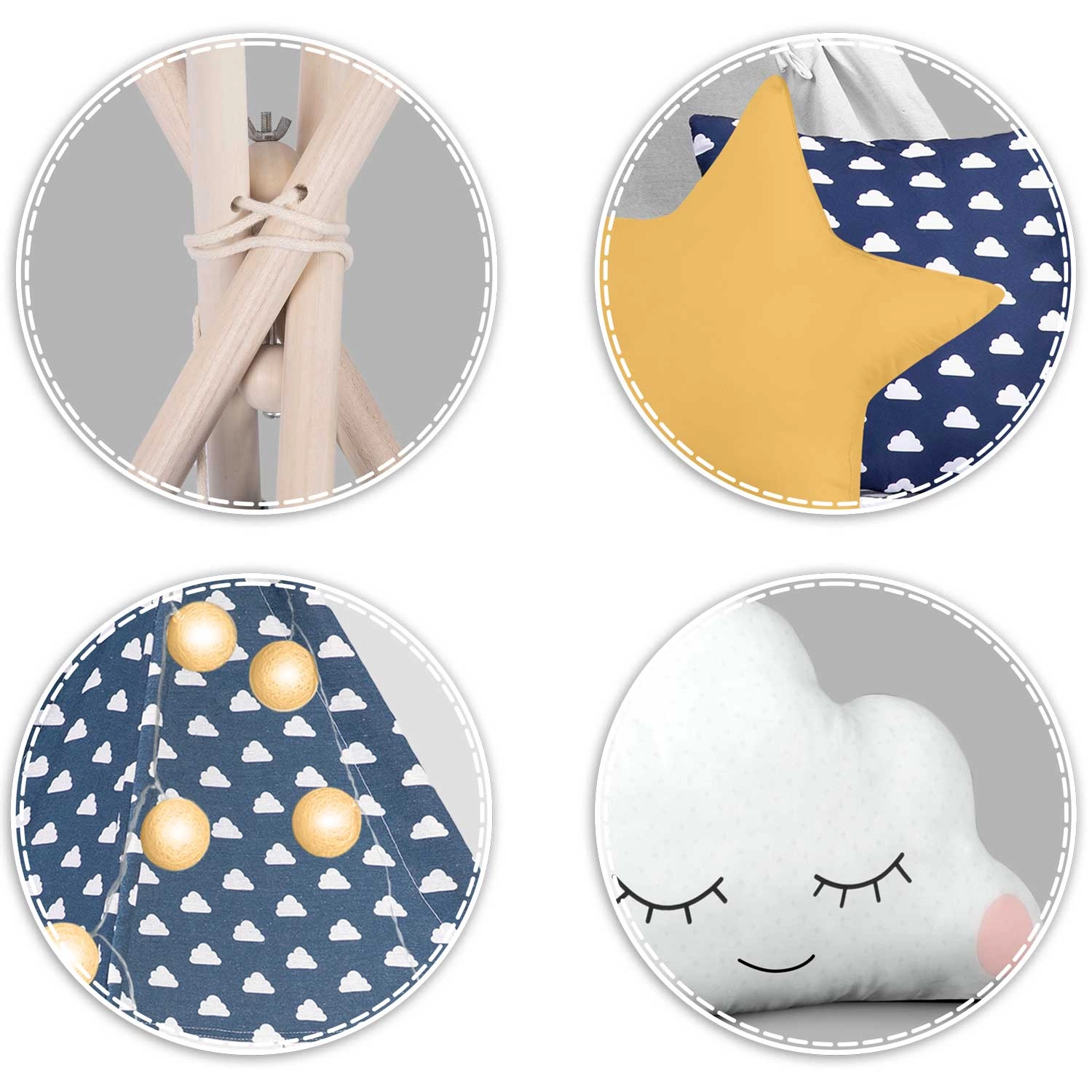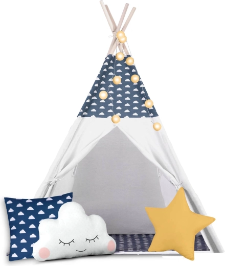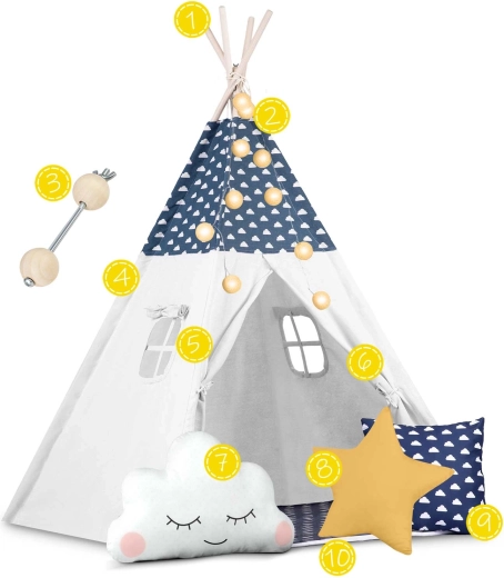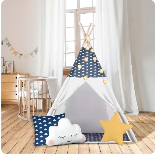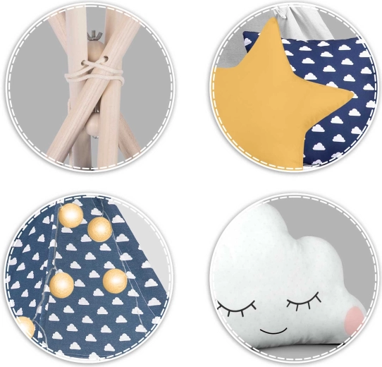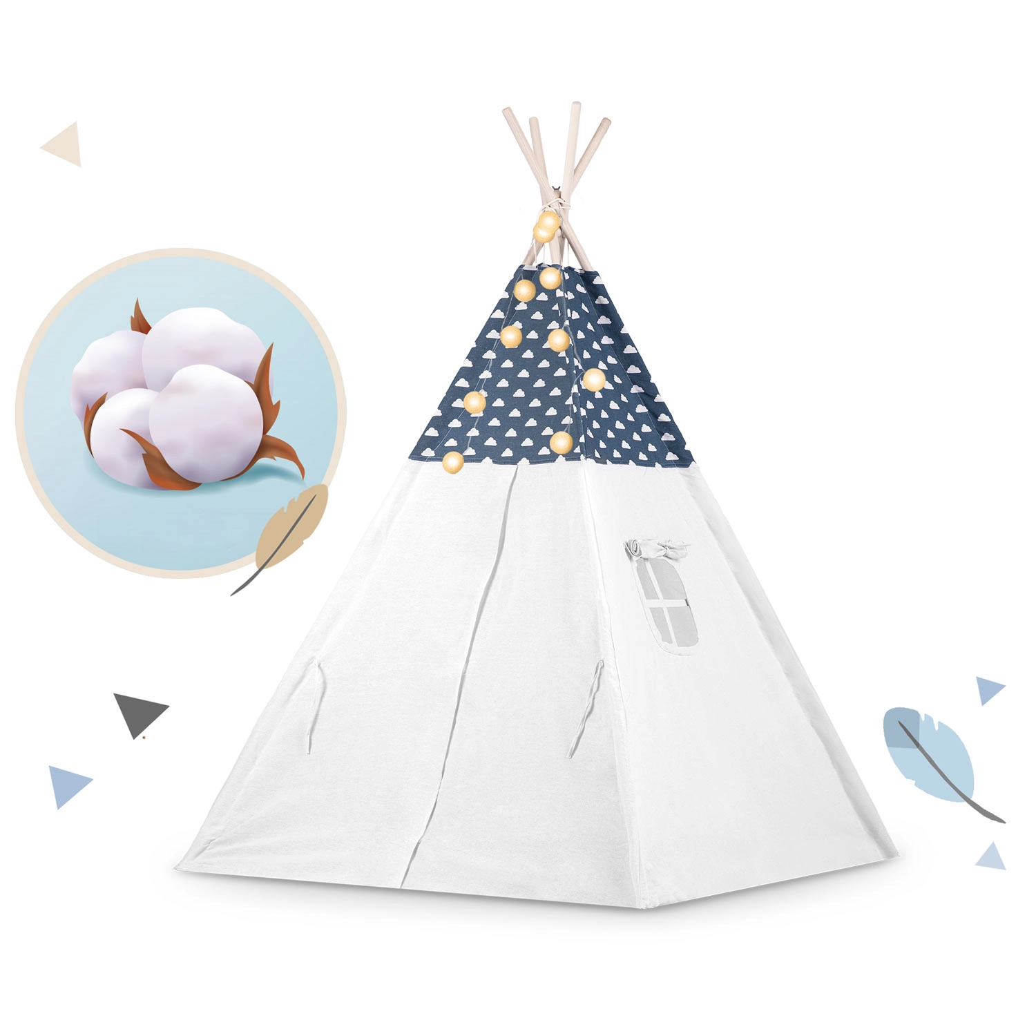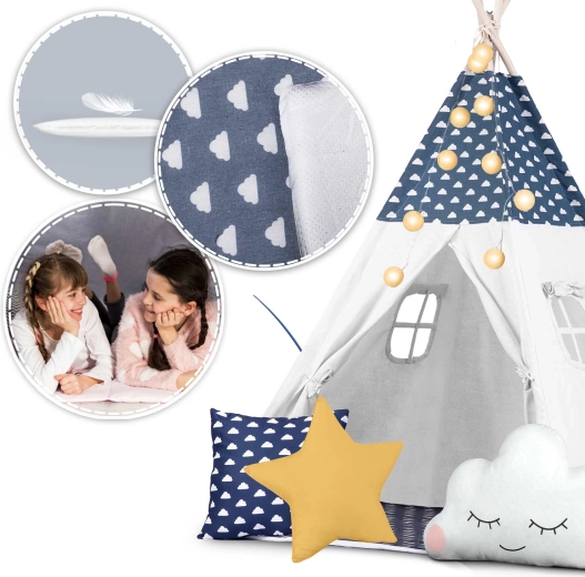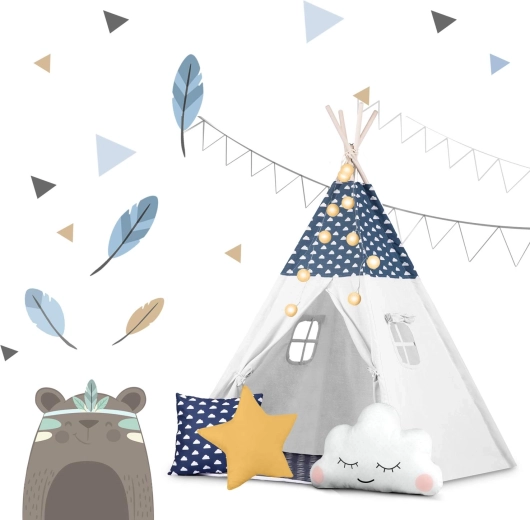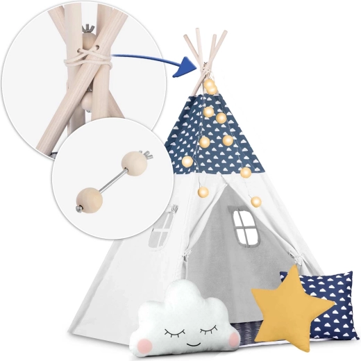 Teepee-ul este confecționat din bumbac premium 100% cu gramaj mai mare pentru finețe, durabilitate și respirabilitate excelentă. Bețele din lemn de pin asigură o structură fermă și stabilă.