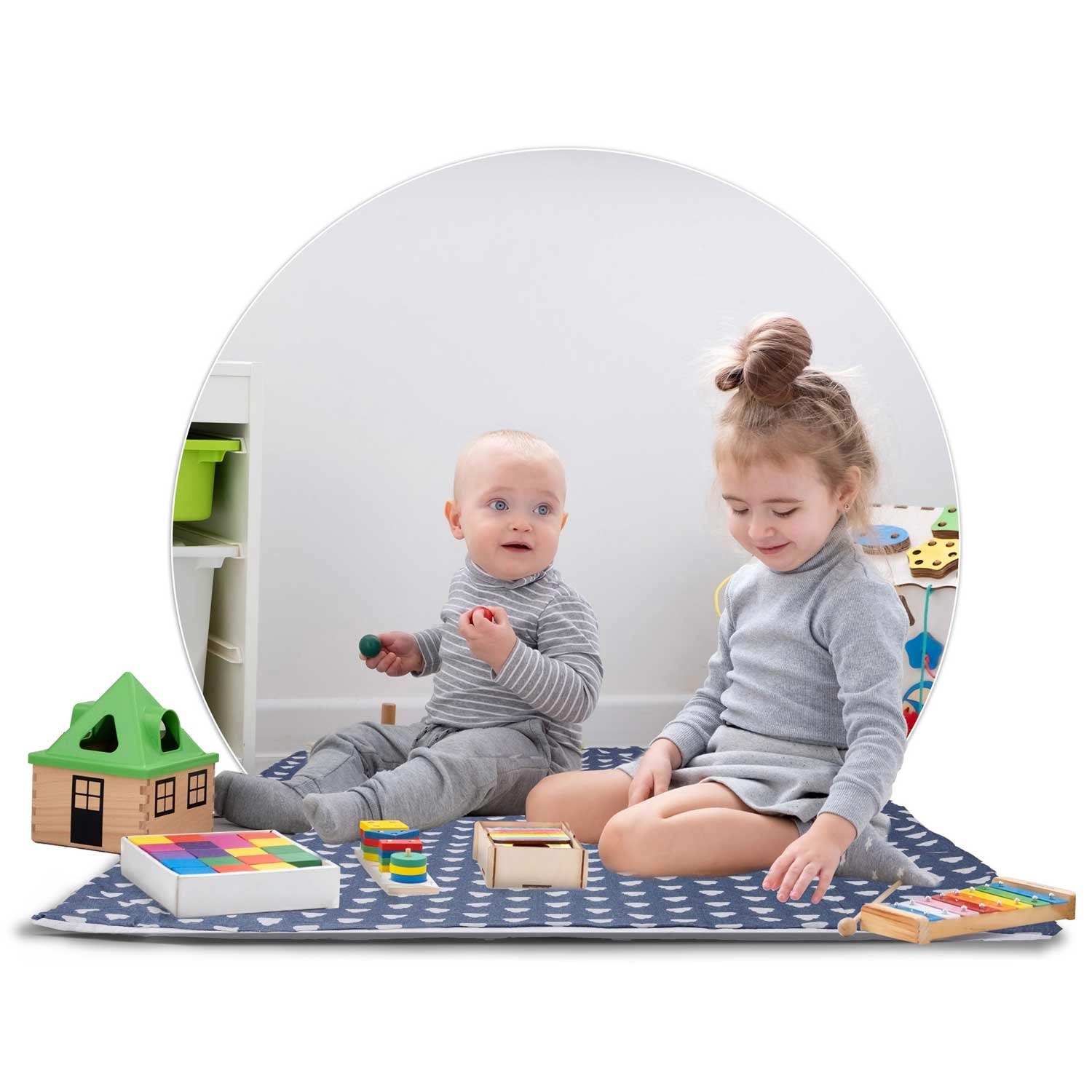 În pachet găsiți luminițele, stabilizatorul, trei perne (norișor, stea, cu model) și o saltea izolatoare groasă cu strat antiderapant – totul asortat pentru un colț de joacă primitor.