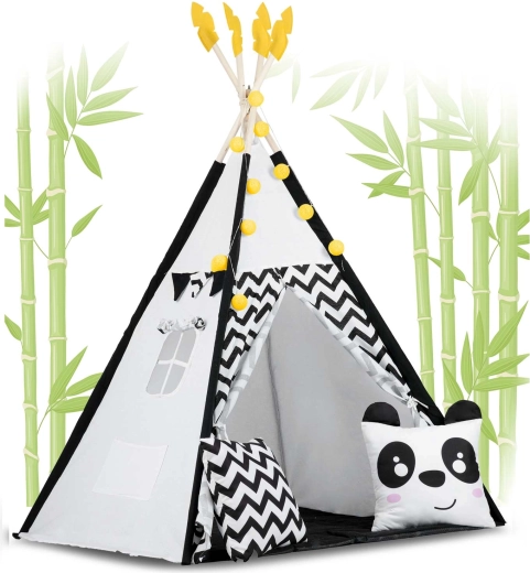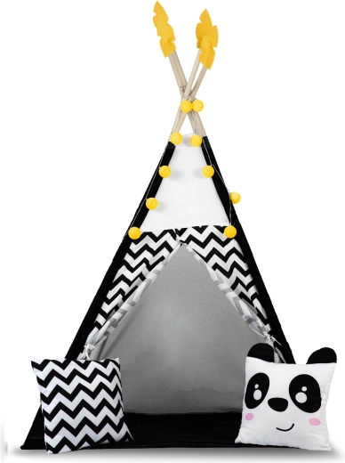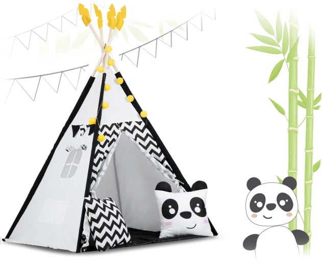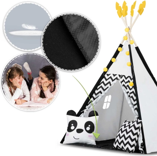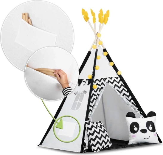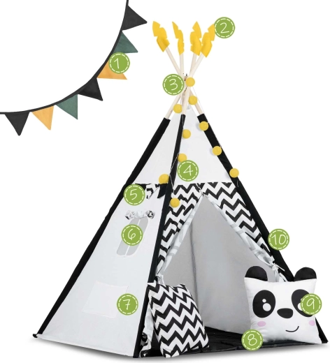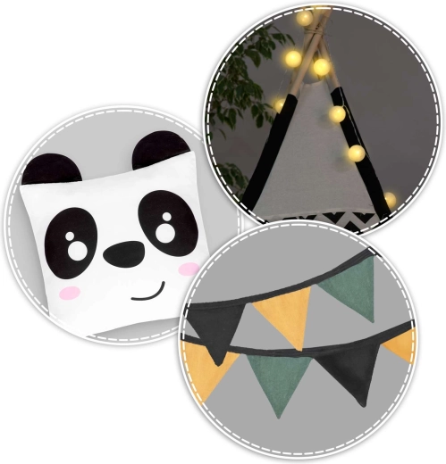Setul include o salteluță izolatoare cu elemente antiderapante, ce poate fi scoasă și folosită separat ca covoraș. Două pernuțe pufoase – inclusiv cu simpaticul motiv panda – creează un colțișor comod pentru odihnă. Fereastra cu roletă, buzunărelul pentru mici comori și intrarea legată cu șnur adaugă și mai multă fantezie jocurilor.