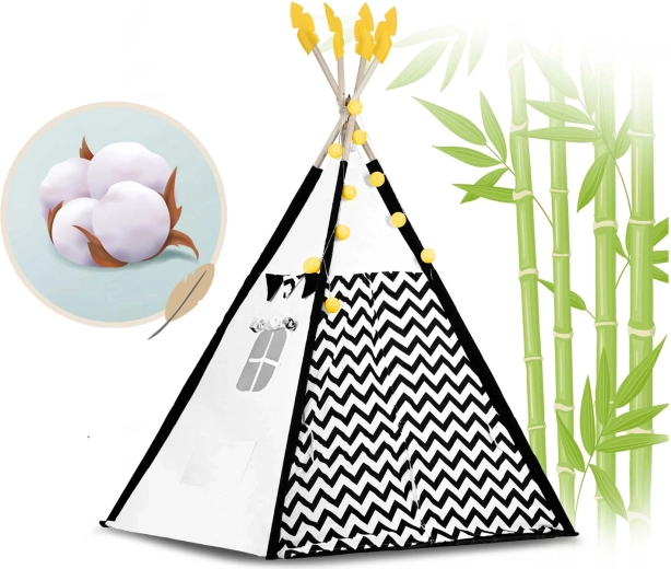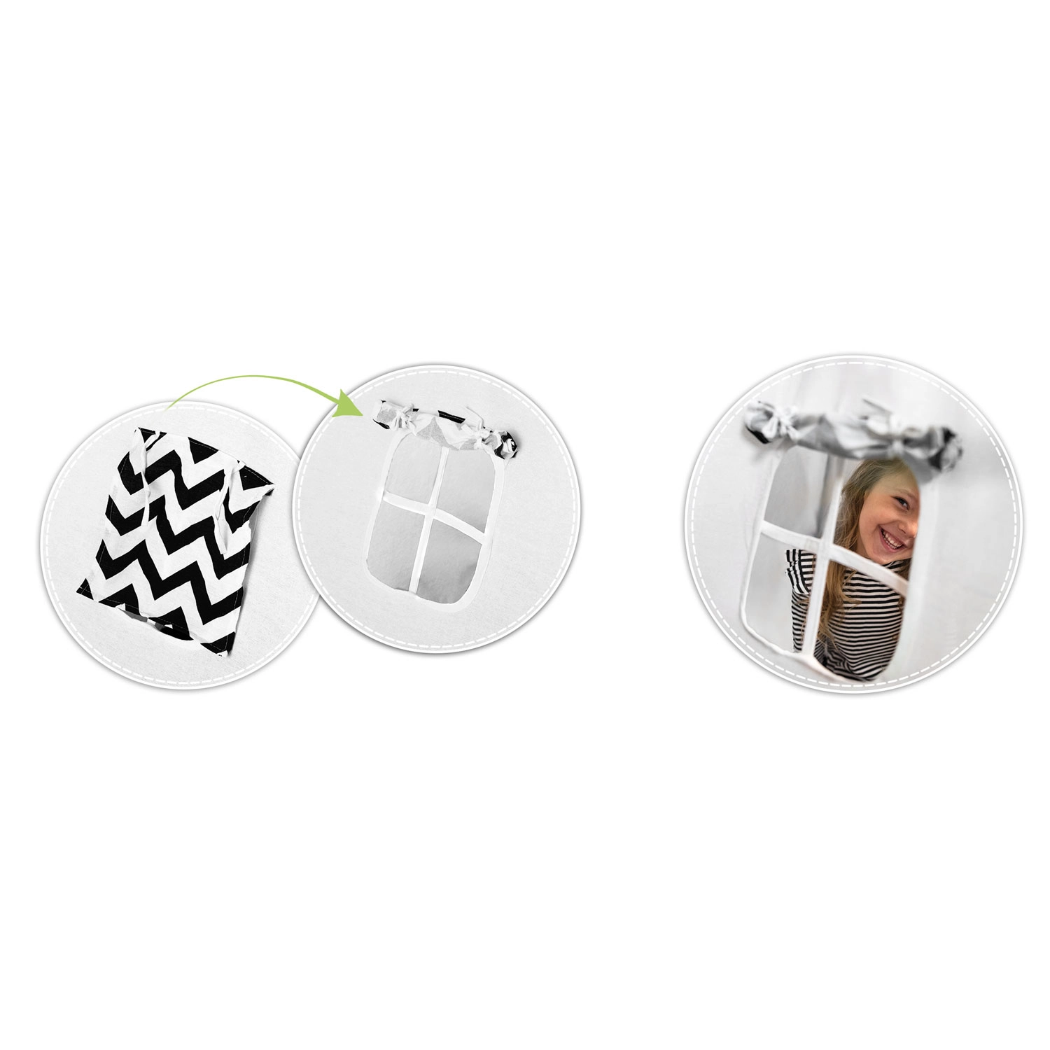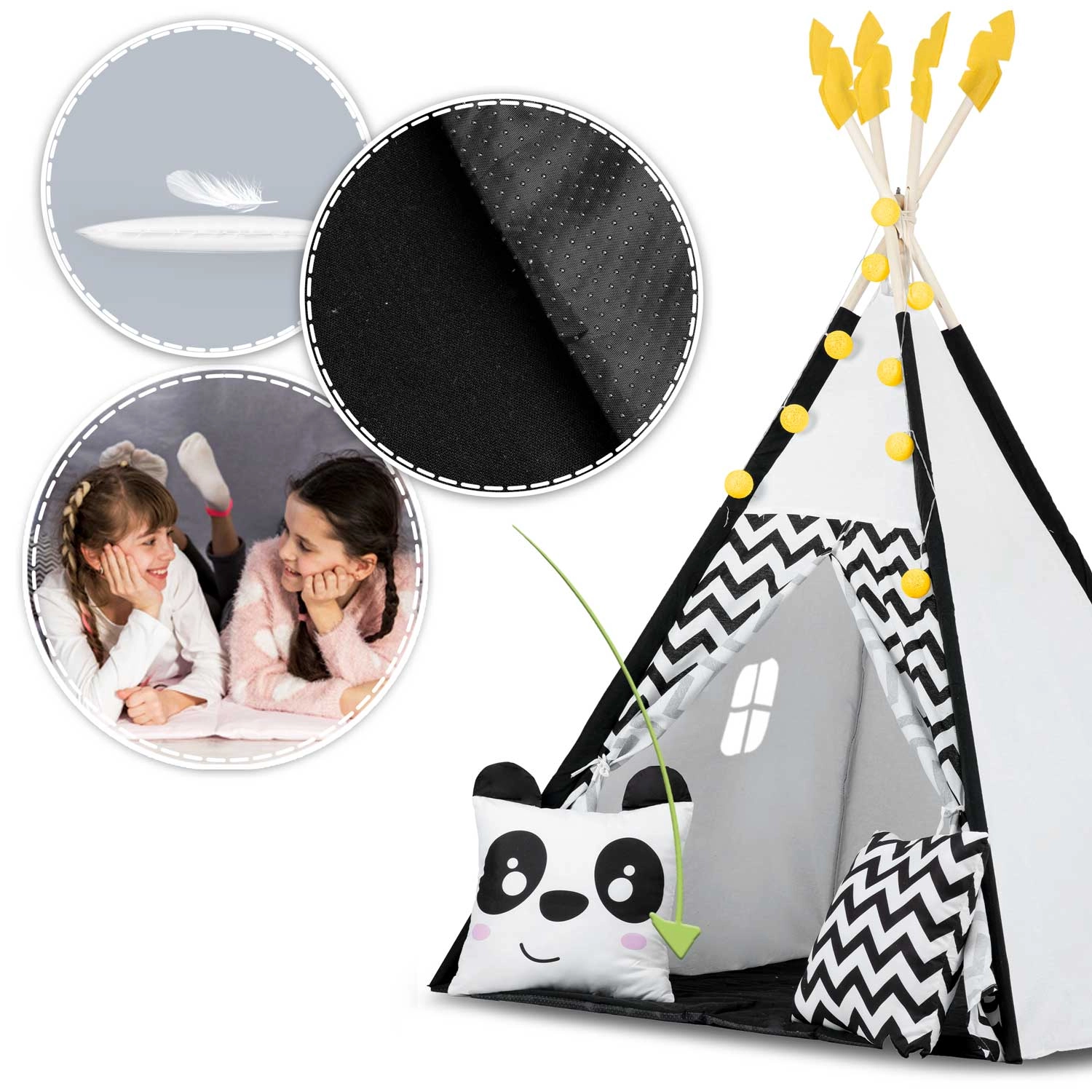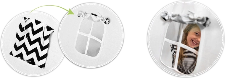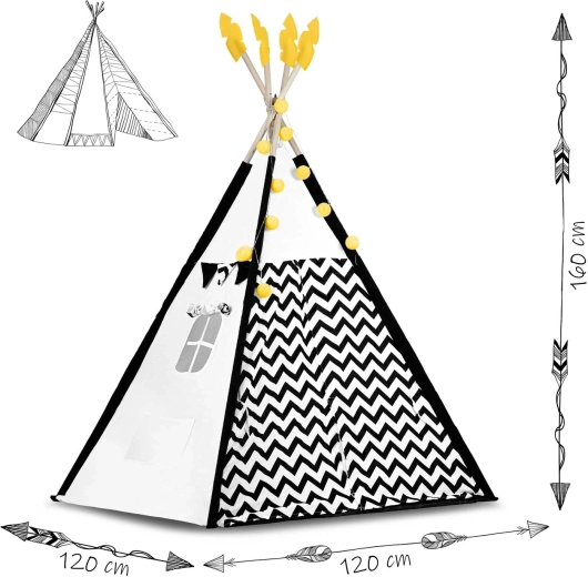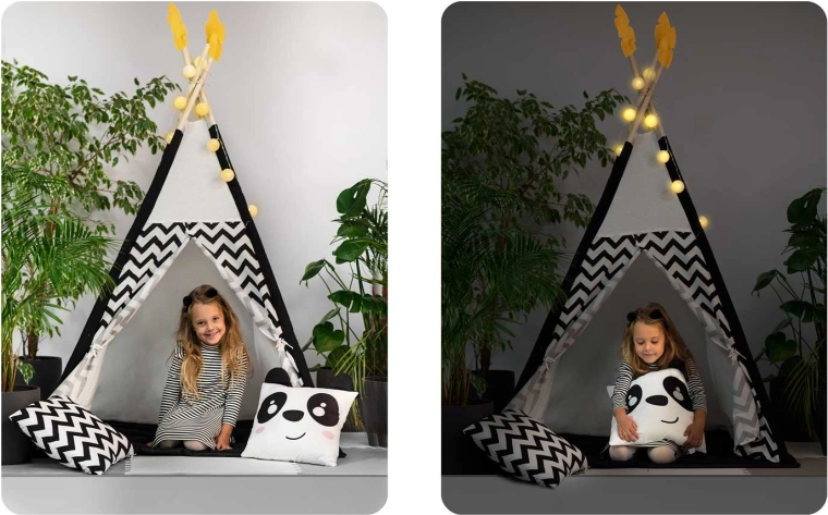 Totul într-un singur set: ghirlandă, „pene” decorative, luminițe LED pe baterii (bateriile nu sunt incluse), stabilizator, 4 bețe din pin, roletă pentru fereastră, fereastră, buzunărel, salteluță moale, 2 perne și panouri frontale glisante pentru acces facil. Montaj și pliere rapide, ușor de transportat și potrivit pentru camera copilului sau pe terasă, la umbră.