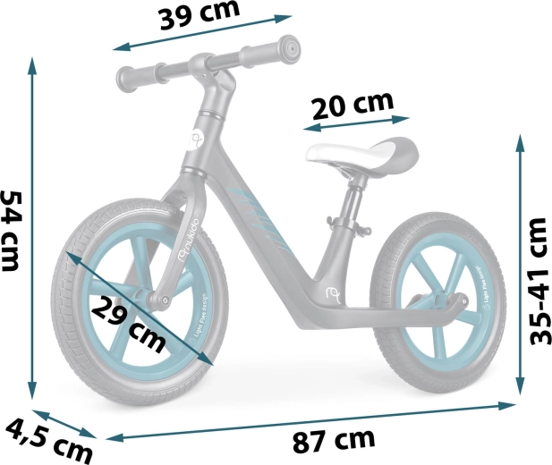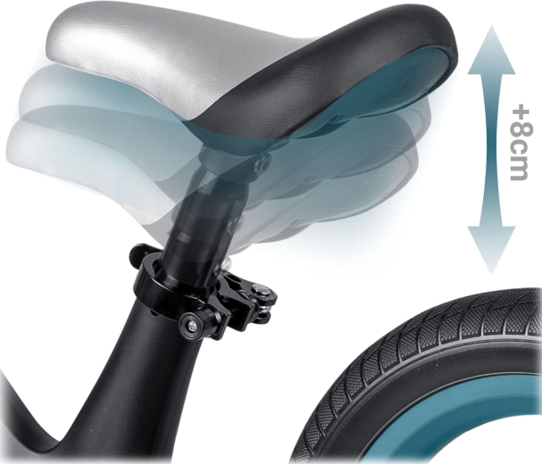 Șeaua moale din spumă, cu reglaj al înălțimii în intervalul aprox. 35–41 cm, asigură poziția corectă și o perioadă de utilizare mai lungă pe măsură ce copilul crește.