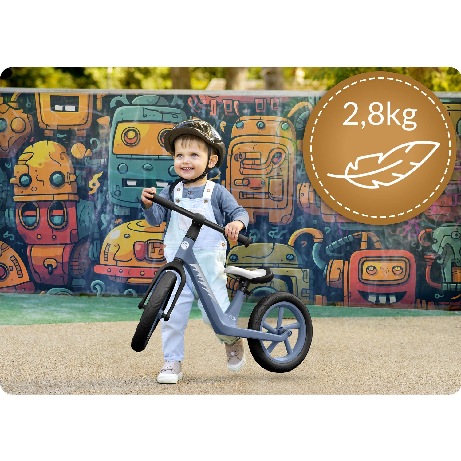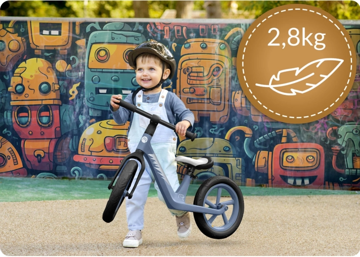 Greutatea de doar 2,8 kg ușurează pornirea, controlul și transportul. Copilul învață mai rapid să își țină echilibrul și să vireze fără efort inutil.