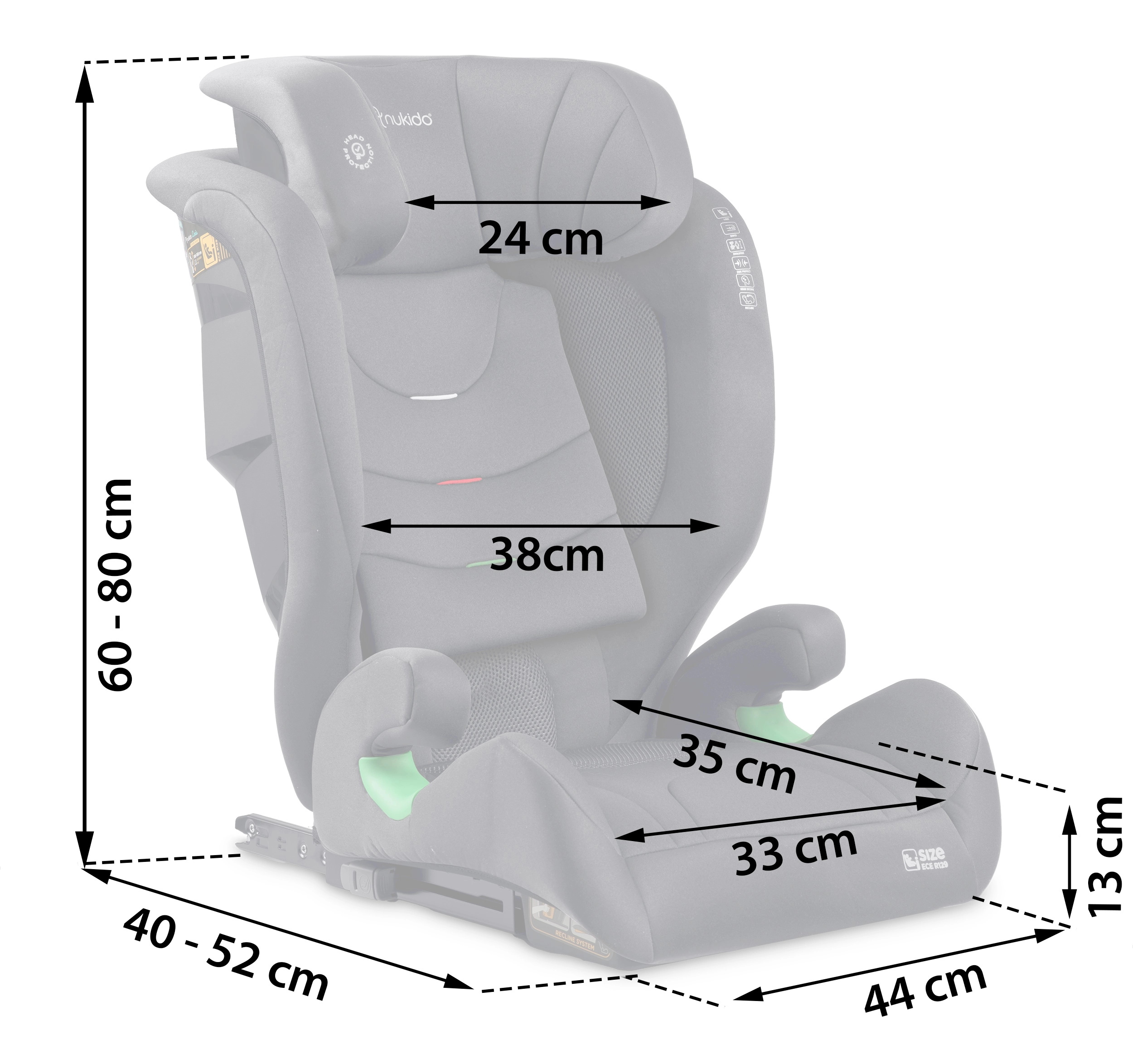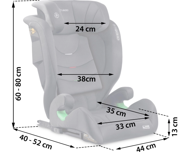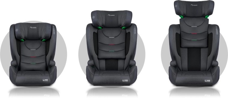 Scaunul este proiectat pentru copii în creștere: 12 niveluri de reglare a înălțimii tetierei permit ajustarea precisă în funcție de înălțimea actuală a copilului, în intervalul 100–150 cm. Pe măsură ce copilul crește, se poate utiliza spătarul înalt sau, ulterior, doar înălțătorul. Husa detașabilă și lavabilă ușurează întreținerea, astfel încât scaunul rămâne curat și proaspăt.