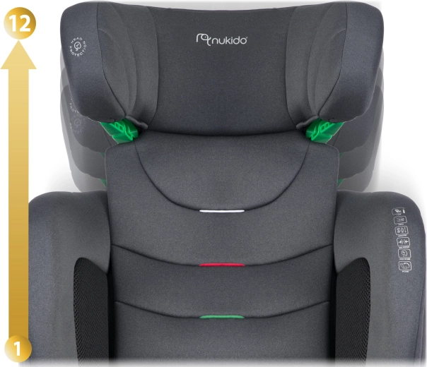 Ajustare fină a înălțimii tetierei în 12 pași pentru poziționarea ideală a centurii și confort de la aprox. 4 până la 12 ani.