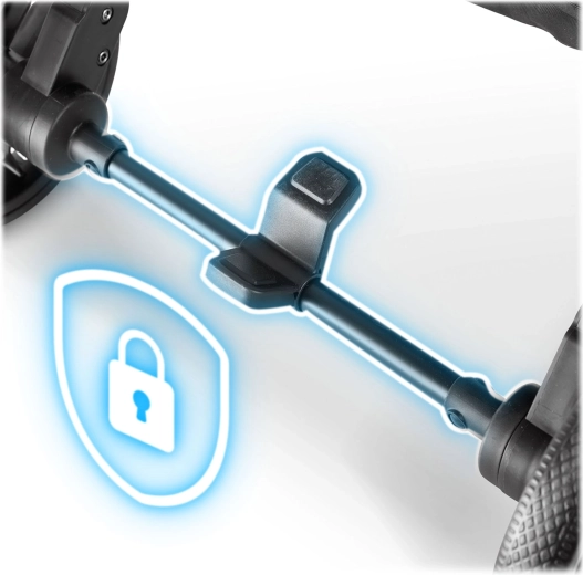 Roți față pivotante 360° cu suspensie pentru manevrare ușoară în spații înguste, roți spate mari pentru stabilitate pe teren și frână fiabilă. Centura în 5 puncte, cu pernițe moi, menține copilul în siguranță.