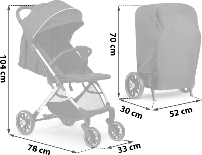 Butonul intuitiv permite plierea căruciorului cu o singură mână într-o clipă. Dimensiunile compacte după pliere se potrivesc în portbagajul mașinii și chiar ca bagaj de mână în avion. Husa de transport practică și mânerul pentru tragere facilitează deplasarea.
