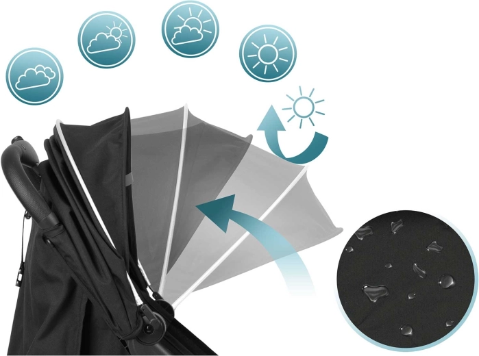 Capotina extensibilă și impermeabilă protejează împotriva soarelui, vântului și a ploii ușoare. Poate fi ajustată în funcție de faptul că micuțul doarme sau explorează împrejurimile. În pachet găsiți și pelerină de ploaie și husă călduroasă pentru picioare.