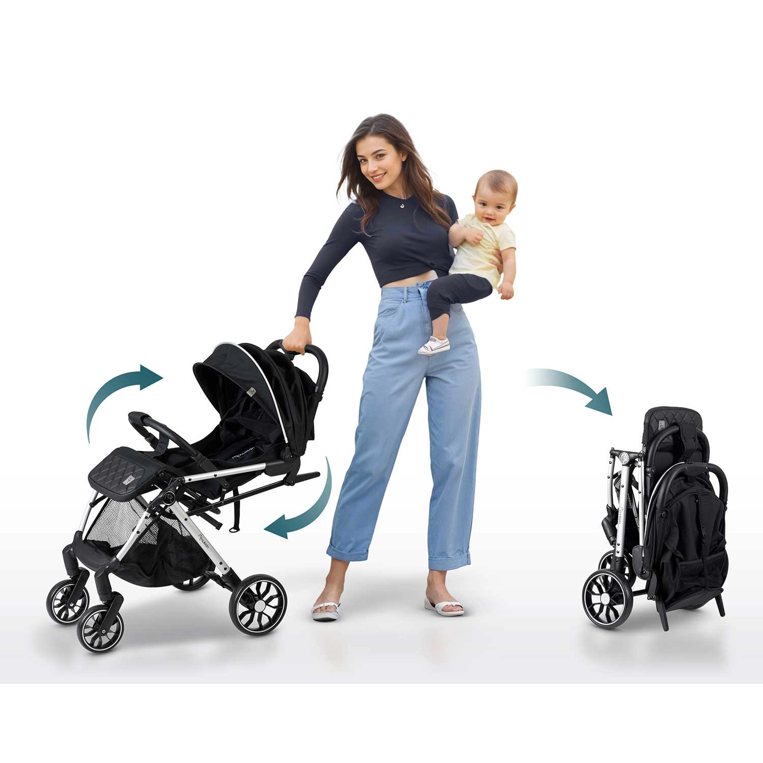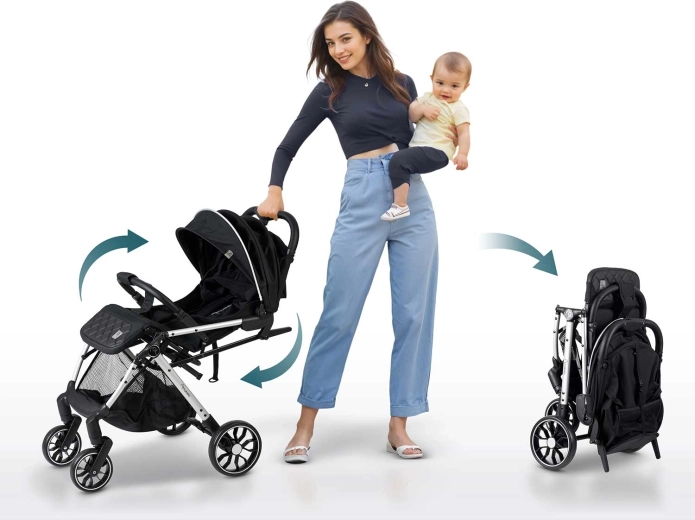 - Pliere rapidă: buton intuitiv pentru pliere în 2 secunde – chiar și cu copilul în brațe.