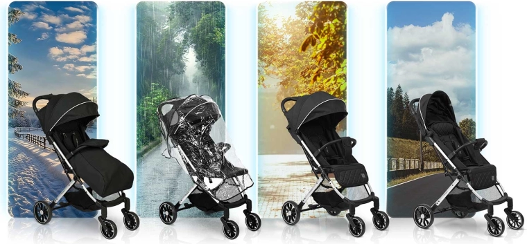 - Confort tot anul: poziționare până la somn, capotină reglabilă cu protecție UV și la ploaie, husă pentru picioare și pelerină de ploaie incluse.