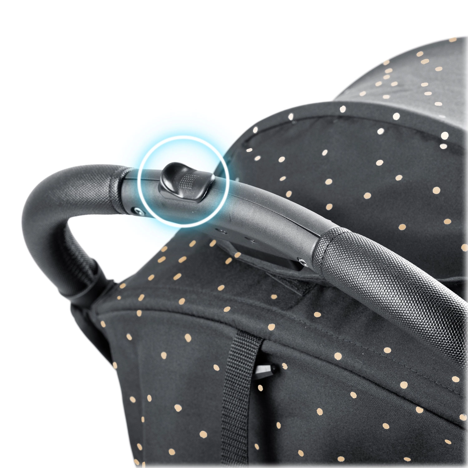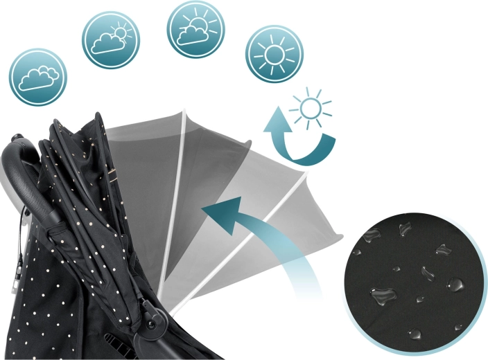Capotina cu mai multe poziții protejează copilul de soare, vânt și ploaie ușoară. Tratamentul hidrofug al materialului facilitează întreținerea și oferă confort în orice anotimp.