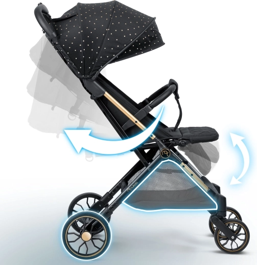 Pentru confortul maxim al copilului există spătar reglabil continuu până la poziția de somn, suport de picioare ajustabil cu suprafață PU rezistentă și capotină extensibilă cu protecție împotriva soarelui, vântului și ploii ușoare. În mod firesc, include centură în 5 puncte cu căptușeală, bară frontală detașabilă și coș spațios pentru tot ce aveți nevoie în deplasare.