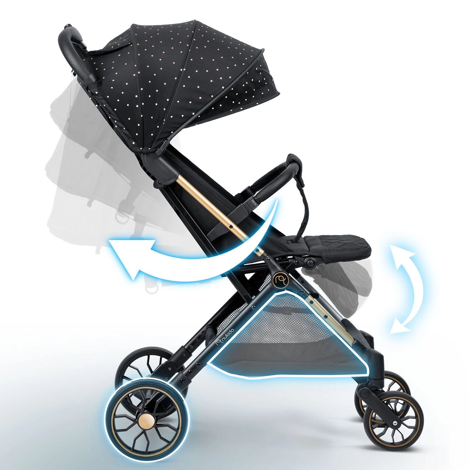 Nukido Paseo combină designul inteligent, siguranța și ușurința în manevrare pentru oraș și parc. Construcția ușoară și solidă, roțile față pivotante cu suspensie și roțile spate mai mari garantează o deplasare lină pe denivelări. Plierea rapidă cu o singură mână și dimensiunile compacte după pliere facilitează transportul și călătoriile – inclusiv cele cu avionul.