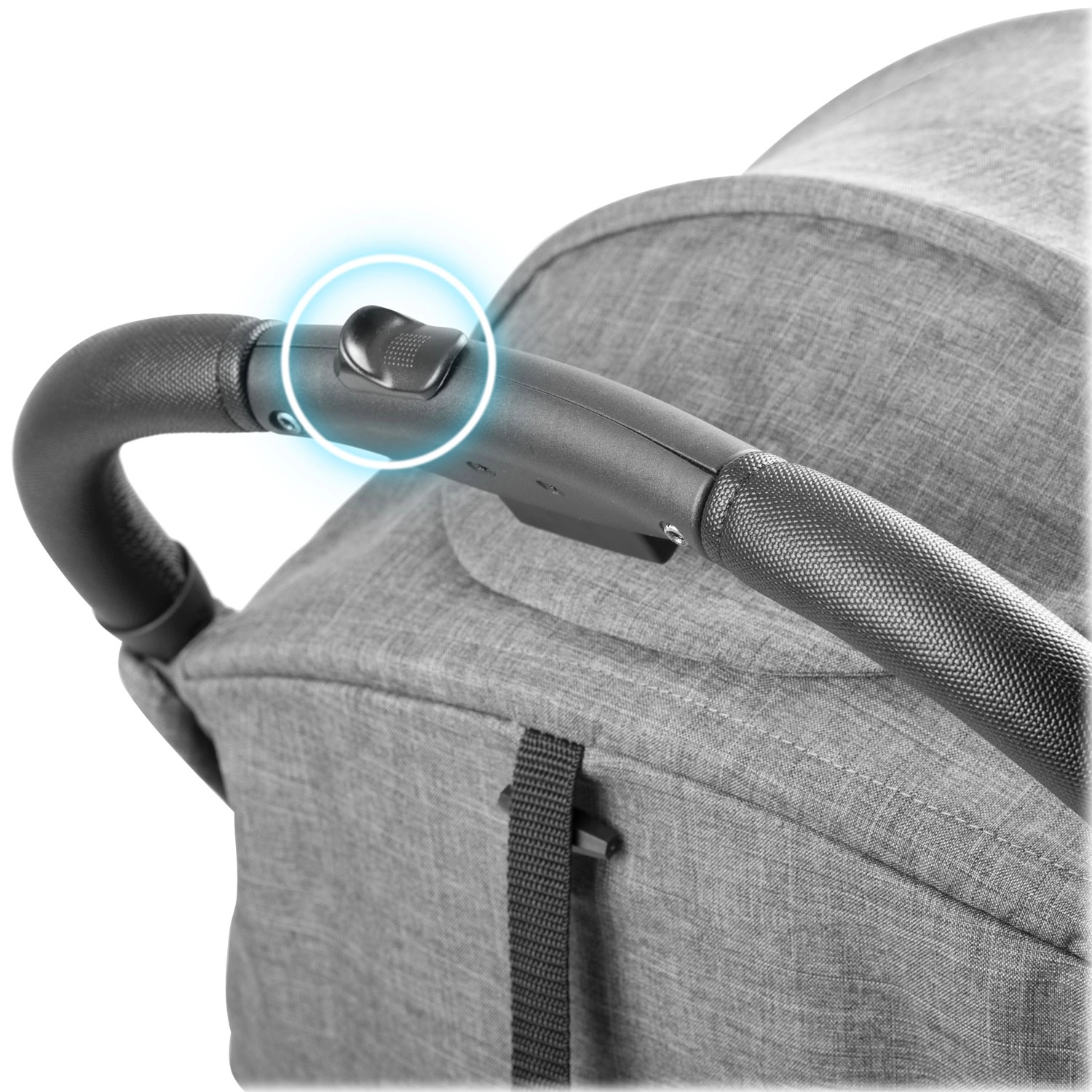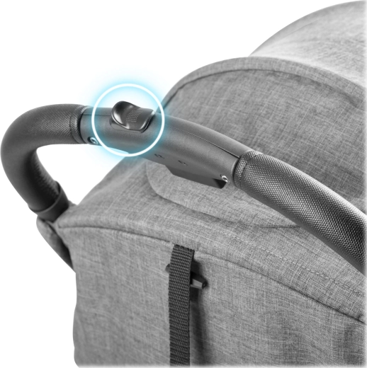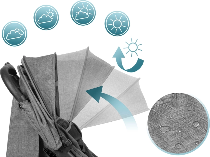Copertina multipoziție protejează de soare și vânt, iar țesătura hidrofugă rezistă la burniță. O puteți deschide după nevoie când copilul doarme sau o puteți ridica pentru un câmp vizual mai bun.