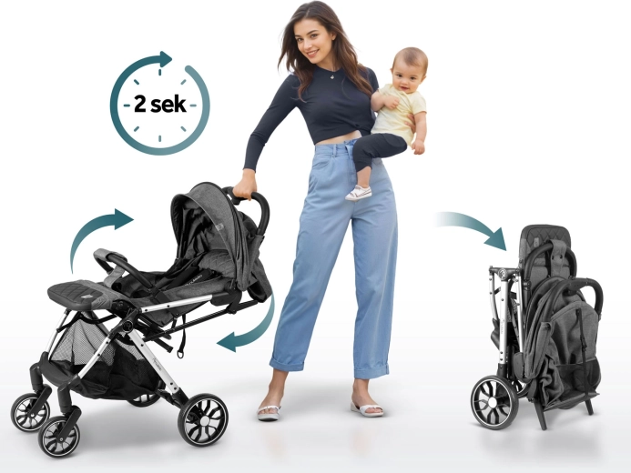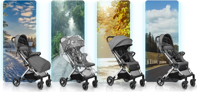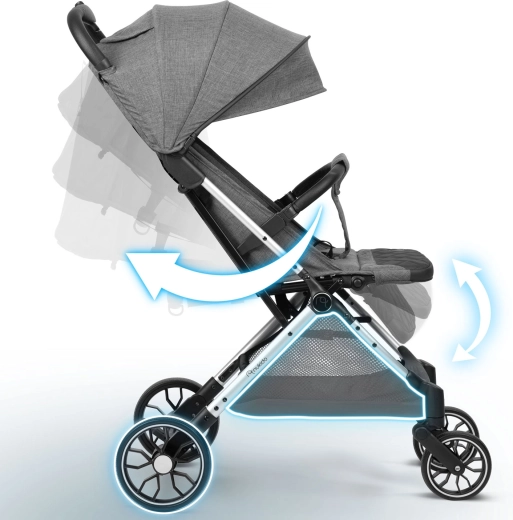 Copertina cu reglaj în mai multe trepte oferă protecție împotriva soarelui, vântului și a ploii ușoare, în timp ce centurile în 5 puncte căptușite și bara frontală detașabilă asigură siguranță și confort. Spătarul reglabil până la poziția de somn și suportul de picioare ajustabil le permit copiilor să se odihnească și să doarmă în timpul plimbărilor mai lungi. Întreținerea este facilitată de pielea ecologică PU pe suportul de picioare, rezistentă la umiditate și pete.