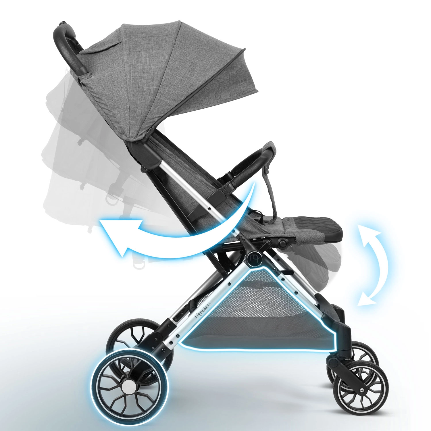 Căruciorul Nukido Paseo este un însoțitor de încredere de la naștere până la 36 de luni. Datorită cadrului din aluminiu este solid și totuși ușor (doar 7,3 kg), se manevrează ușor pe străzi înguste și pe denivelări. Plierea cu o singură mână la dimensiuni compacte îl face o alegere ideală pentru călătorii cu mașina și avionul. Coșul spațios de sub șezut găzduiește toate lucrurile esențiale pentru drum.