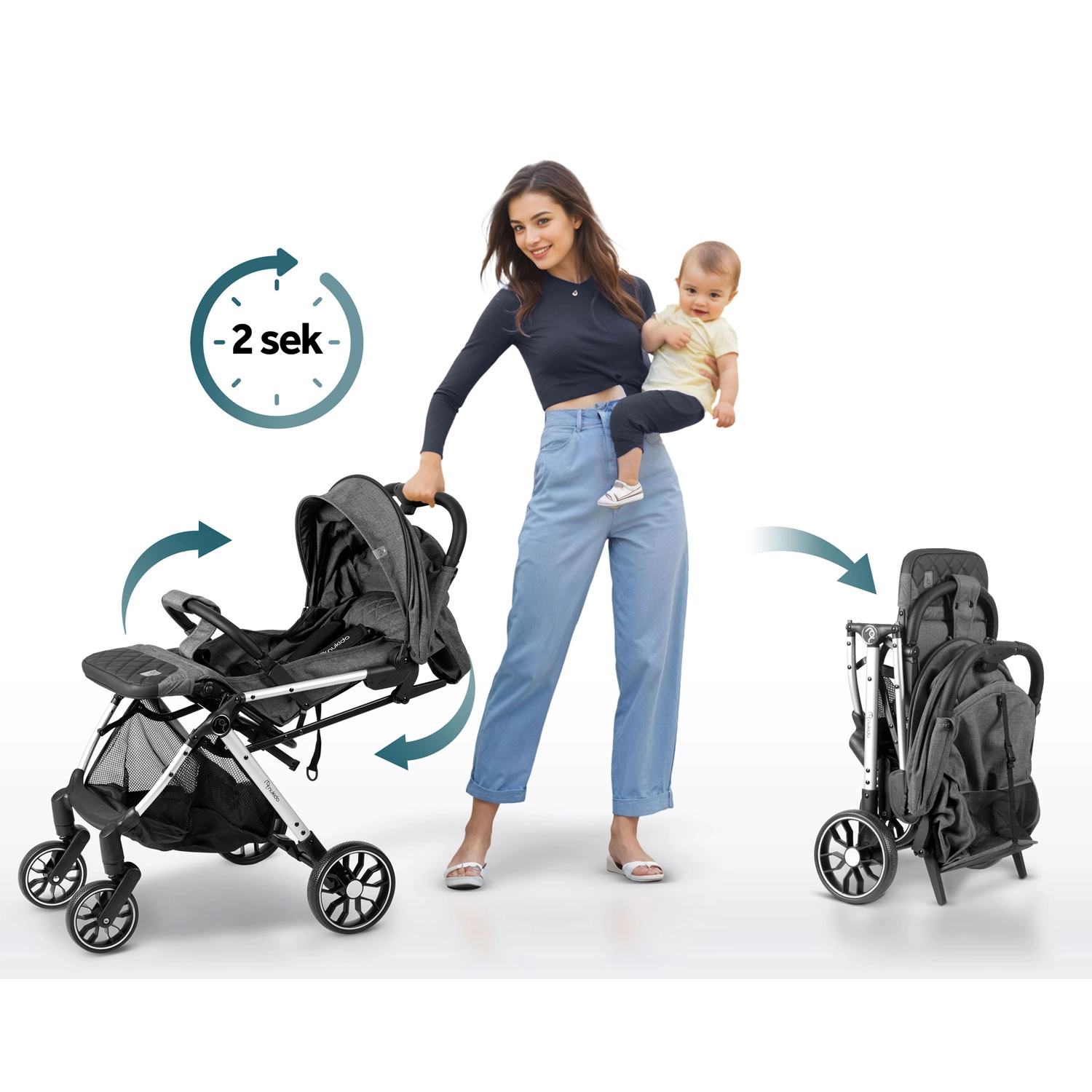 Bucurați-vă de plimbări confortabile prin oraș și pe teren variat cu căruciorul sport Nukido Paseo. Acest cărucior ușor și compact se pliază cu o singură mână în 2 secunde până la dimensiunea unui bagaj de mână. Oferă roți față pivotante 360° cu suspensie, roți spate mari pentru stabilitate, centură de siguranță în 5 puncte, spătar reglabil până la poziția de somn, suport pentru picioare ajustabil și copertină extensibilă cu protecție împotriva ploii și UV. Pachetul include folie de ploaie și husă pentru picioare pentru utilizare pe tot parcursul anului.