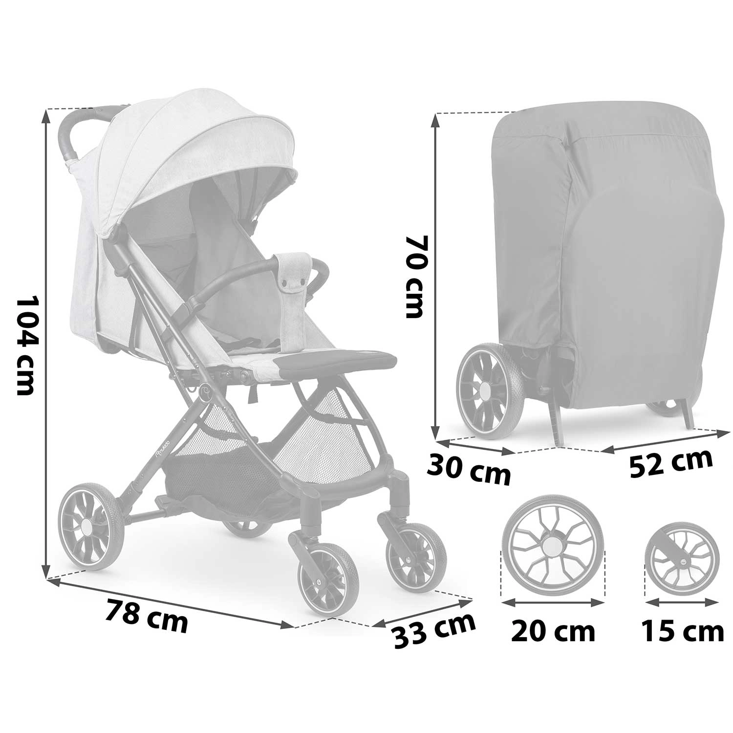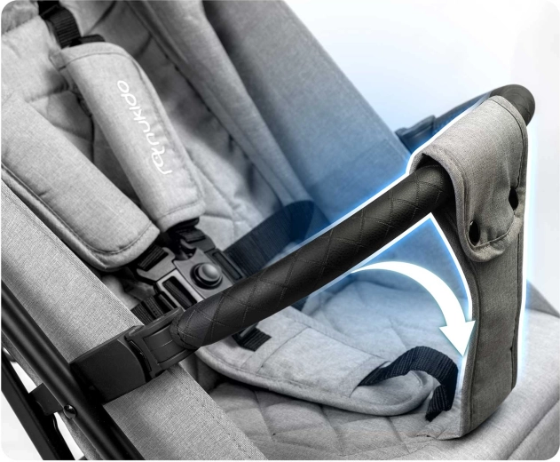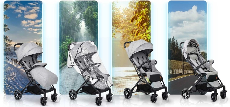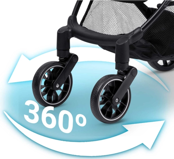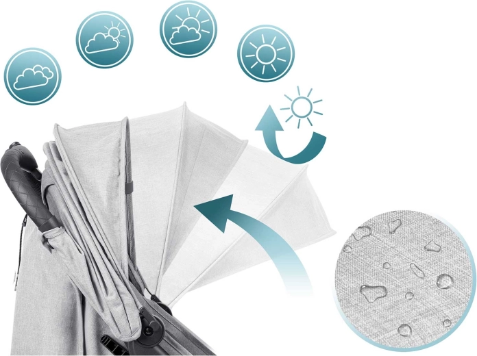 Echiparea practică include coș spațios sub șezut, bară frontală detașabilă pentru așezarea facilă a copilului, folie de ploaie și husă pentru picioare incluse și textile sigure, moi și plăcute la atingere. Copertina mare, cu posibilitate de extindere, protejează împotriva soarelui, vântului și ploii ușoare și se adaptează fie că micuțul doarme, fie privește lumea din jur.