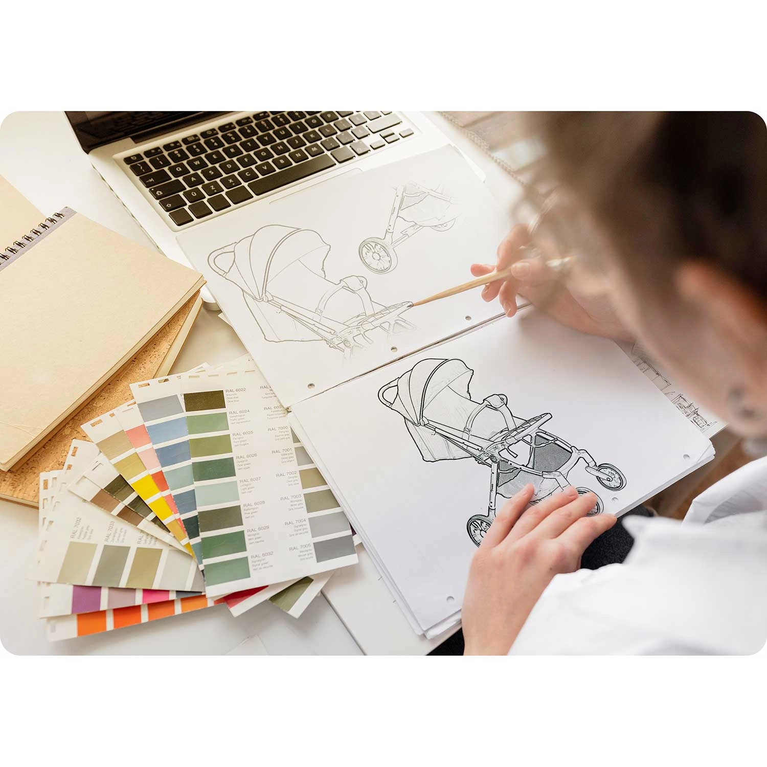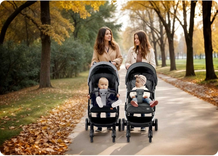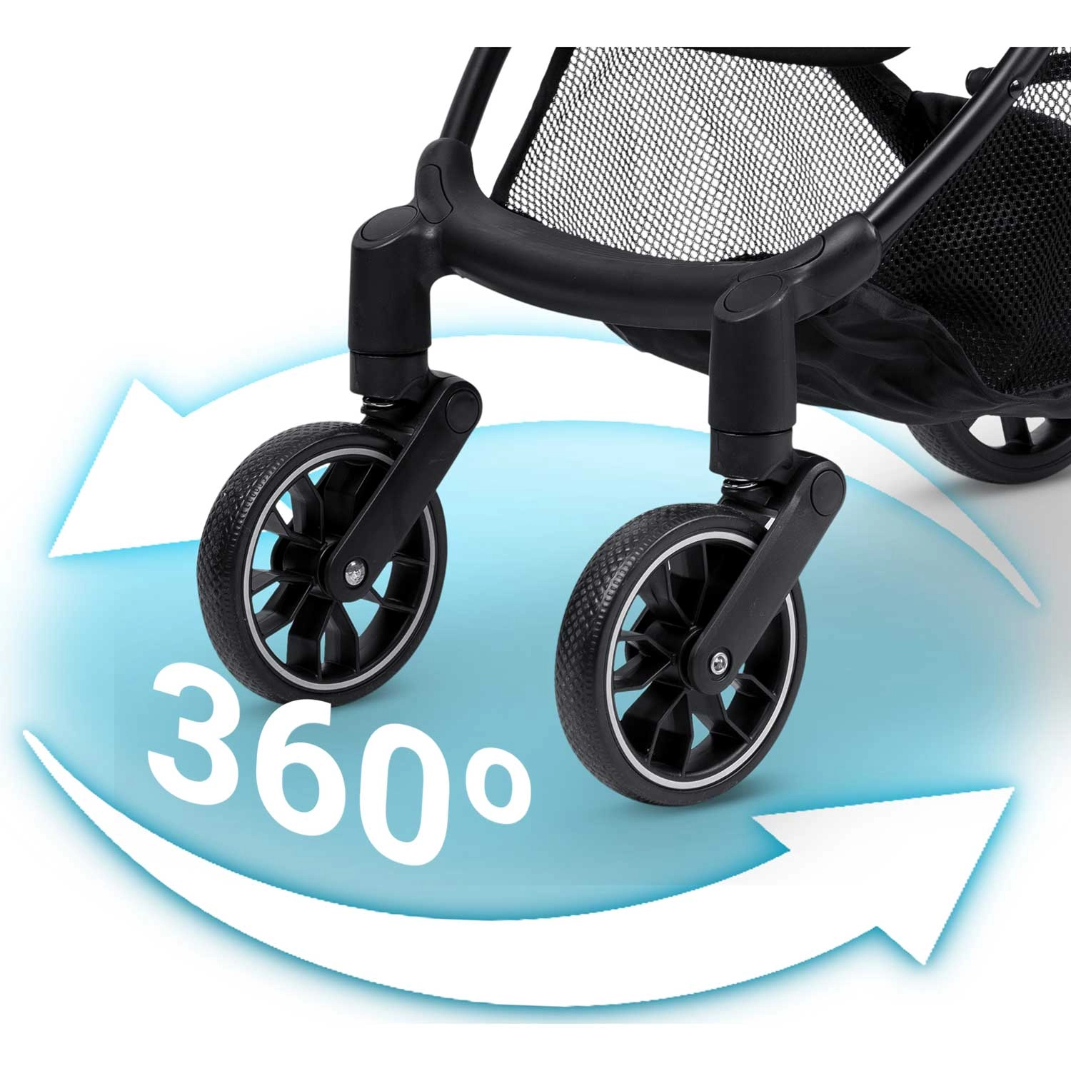 Manevrare ușoară în spații înguste și rulare lină pe denivelări. Suspensia reduce vibrațiile pentru un confort sporit și protecția copilului.