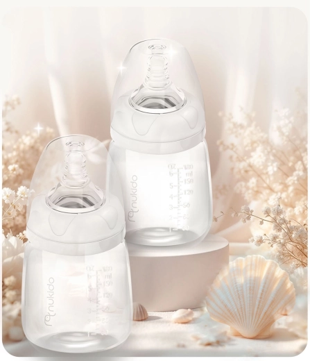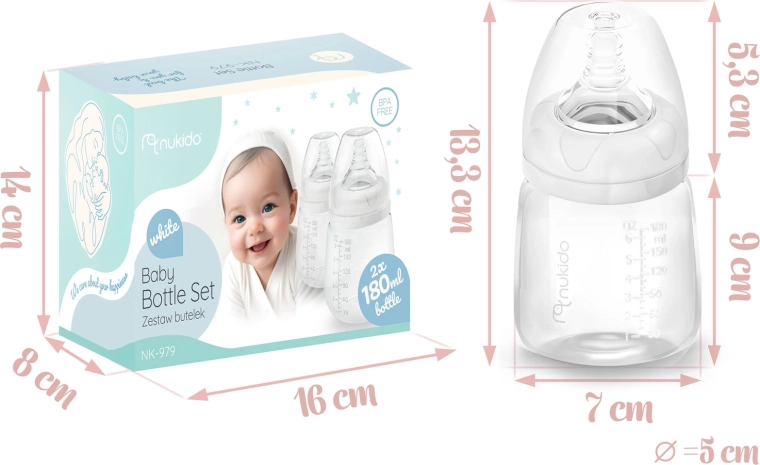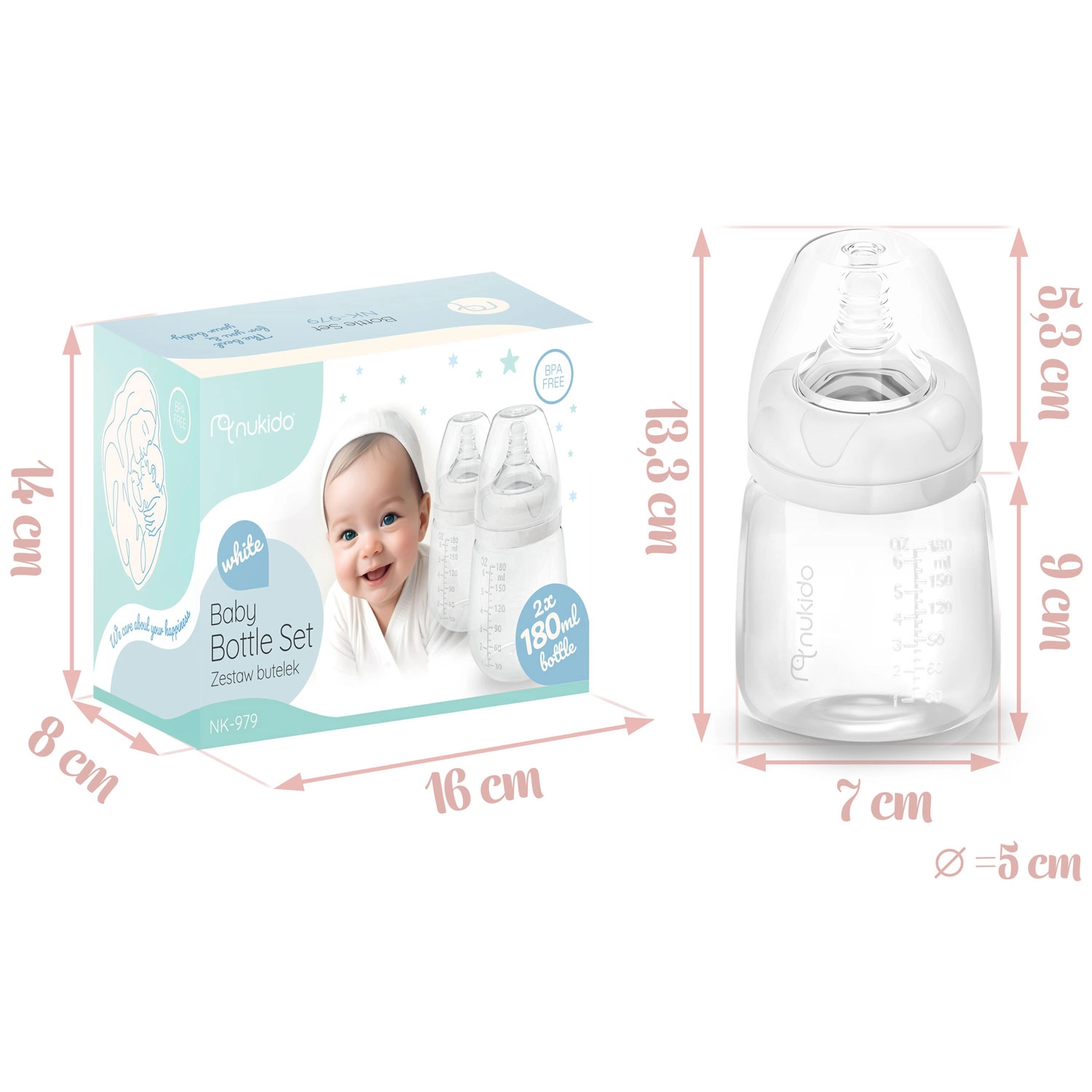 Set practic de două biberoane de 180 ml din polipropilenă sigură pentru hrănirea zilnică. Sticlele sunt ușoare, ușor de ținut în mână și au graduări lizibile, gât larg pentru curățare facilă și tetiță din silicon dinamică care imită mișcarea mamelonului. Sunt fără BPA, compatibile cu pompele NUKIDO și pot fi spălate în mașina de spălat vase sau manual.