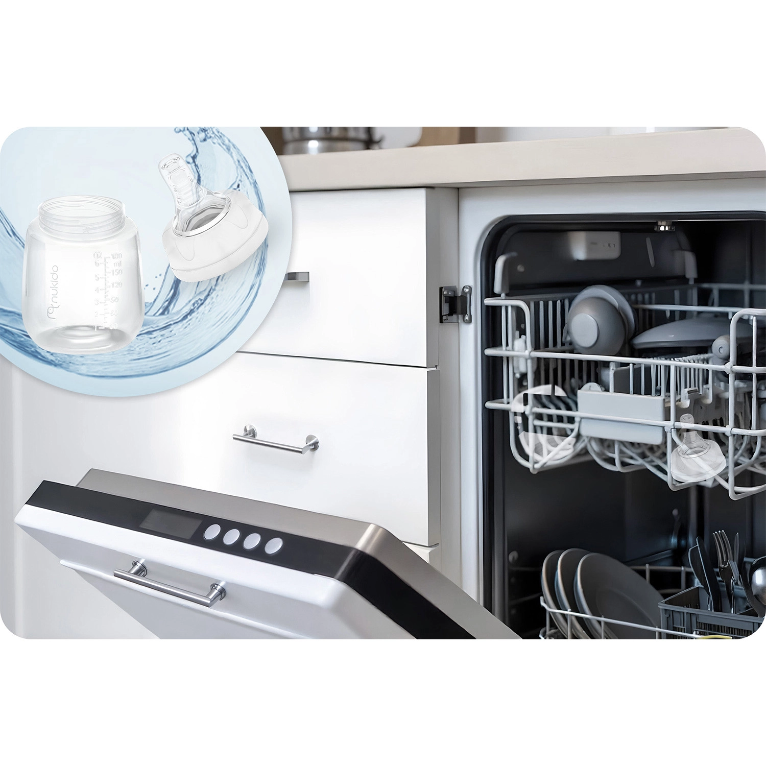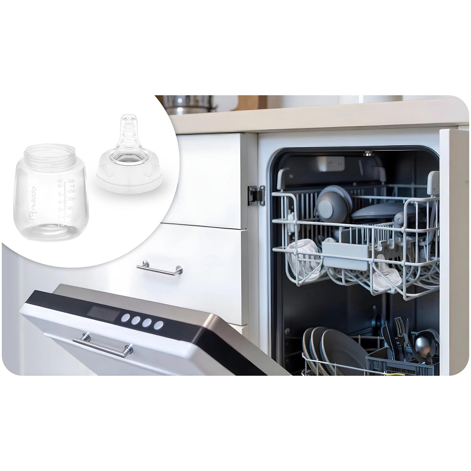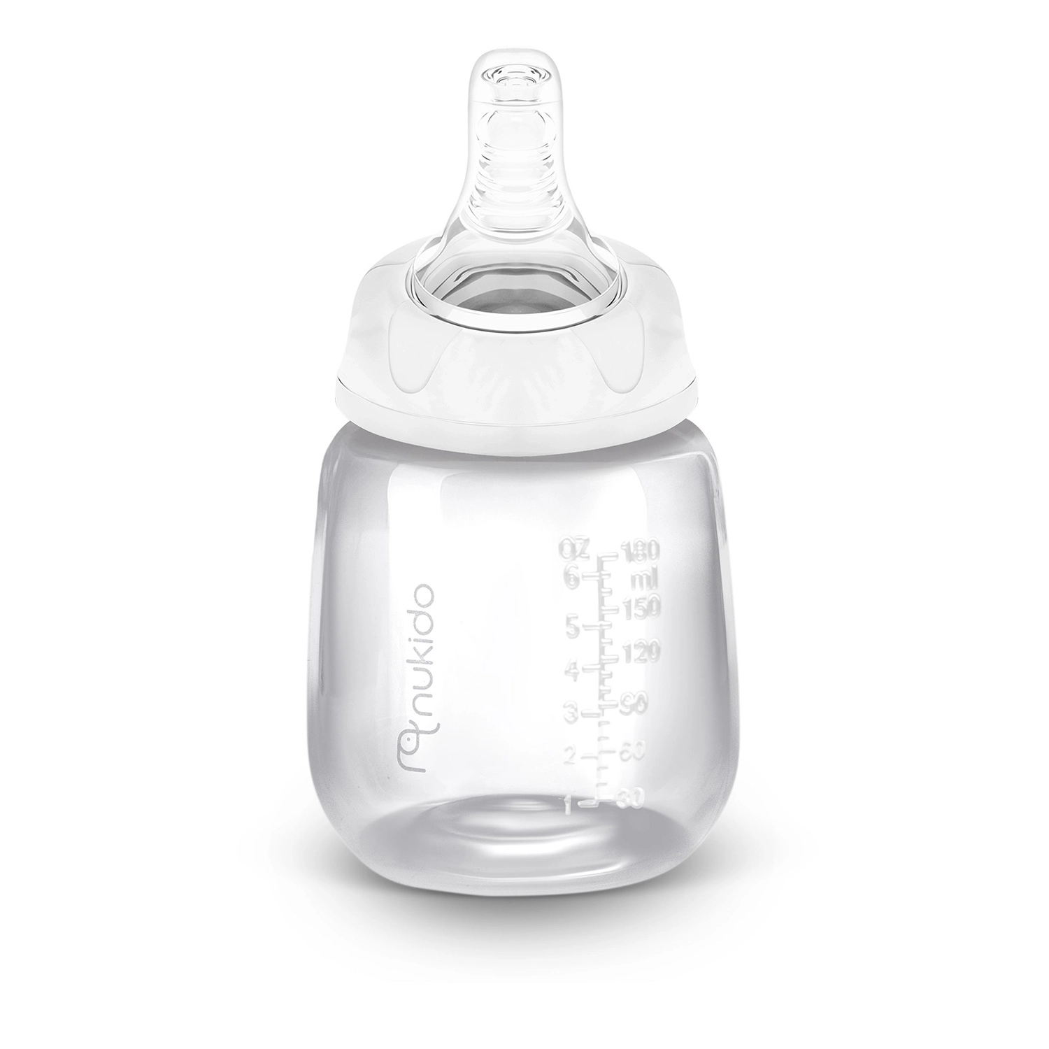 Setul NUKIDO include două biberoane durabile și reutilizabile de 180 ml, fabricate din polipropilenă ușoară și nedeztructibilă. Datorită gâtului larg, umplerea și curățarea sunt rapide și igienice, iar gradațiile lizibile permit dozare precisă. Sunt incluse capace și dopuri anti-scurgere, astfel încât laptele sau hrana lichidă pot fi depozitate în siguranță și luate în călătorii.