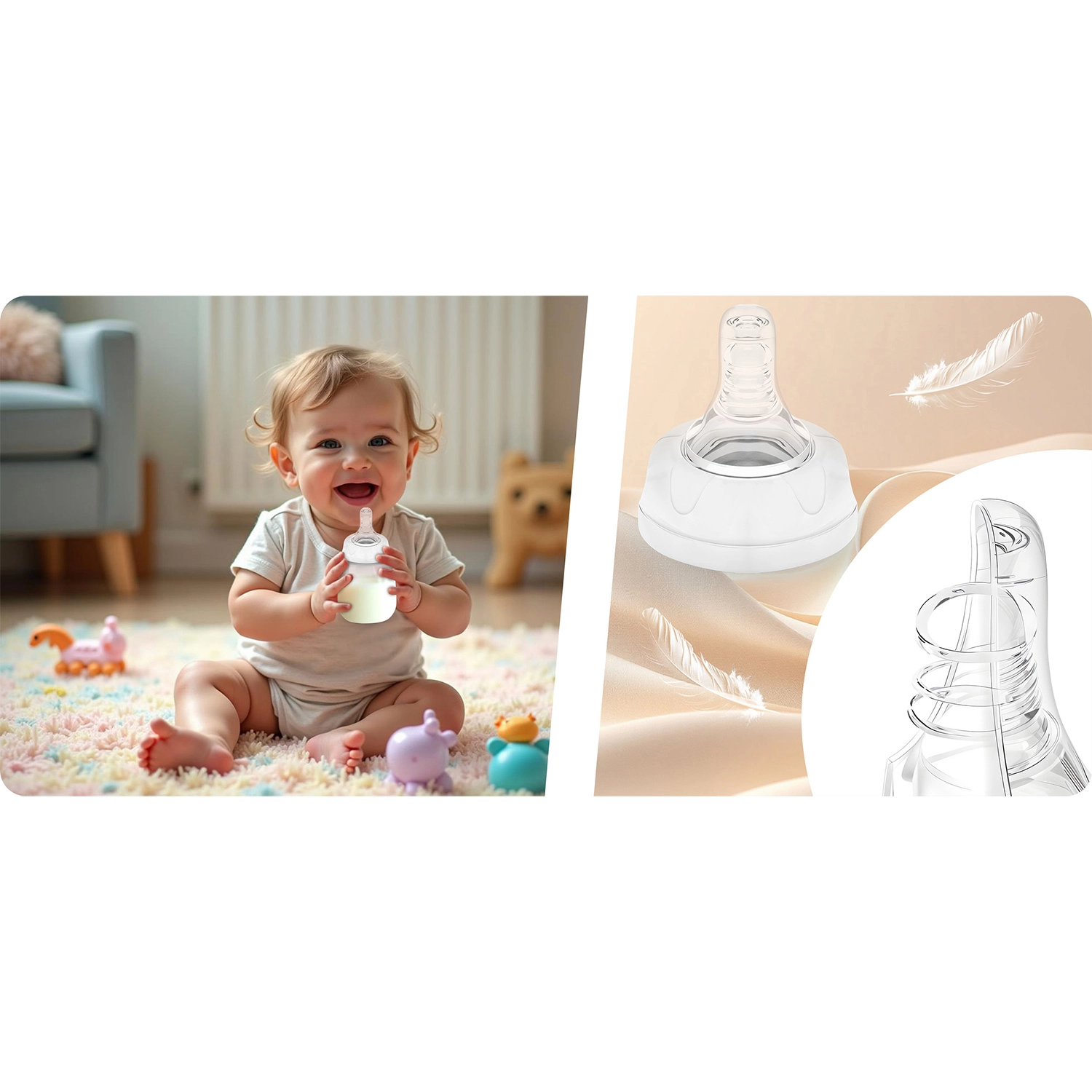 Tetița lată și moale, cu canale de ventilație, imită mamelonul, susține dezvoltarea corectă a cavității bucale și ajută la prevenirea confuziei sân-tetină.