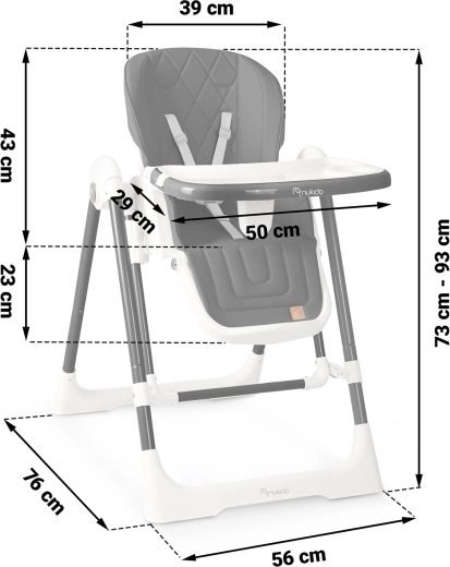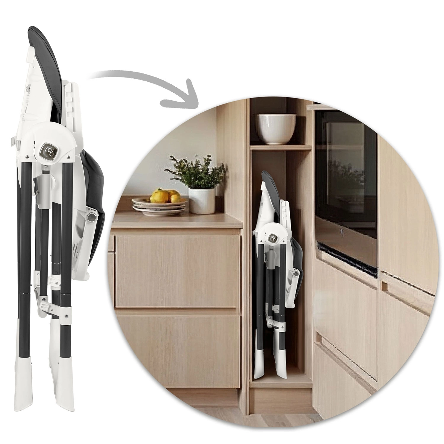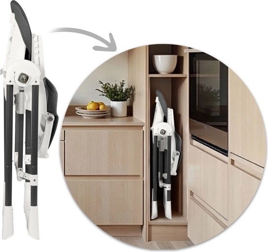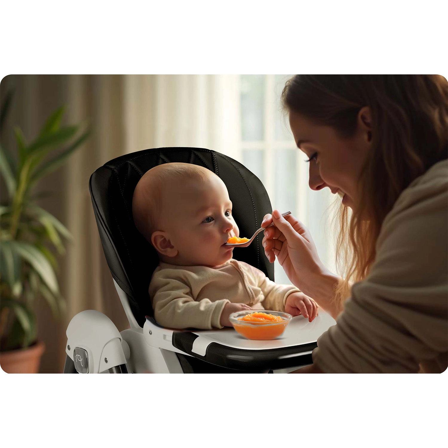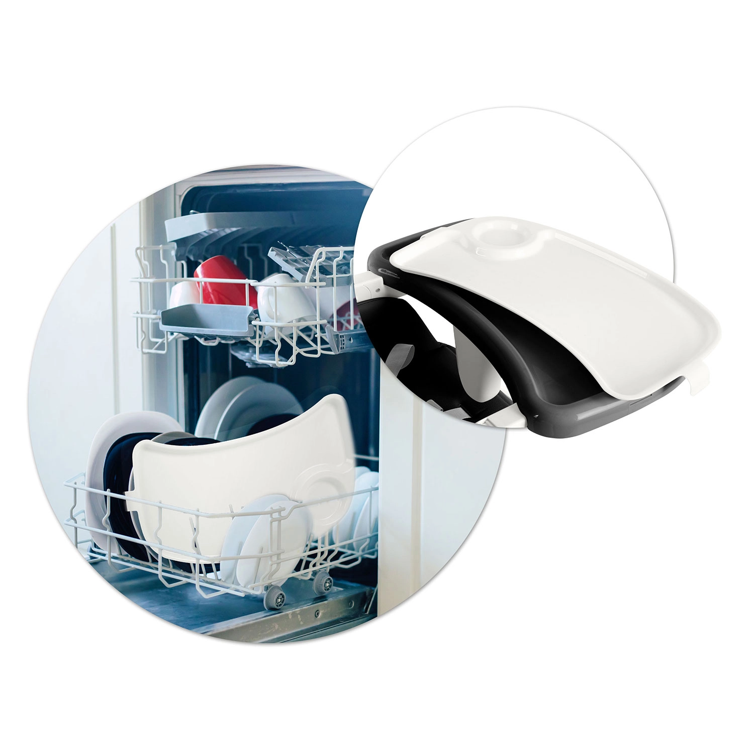 Insertul superior al tăviței se poate scoate și clăti, husa nu absoarbe murdăria – este suficientă o ștergere, iar scaunul este din nou curat în câteva clipe.