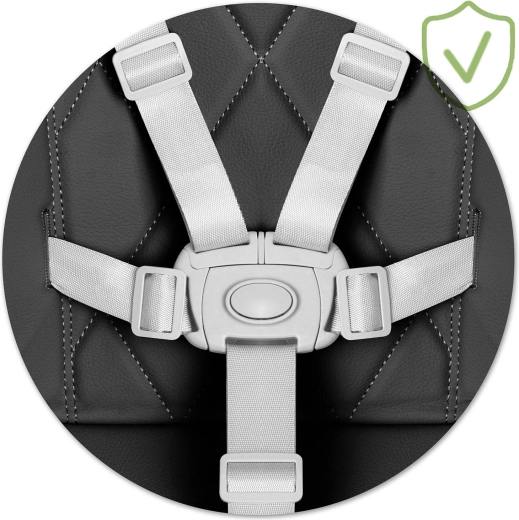 Centurile rezistente, reglabile pe lungime, în 5 puncte, cu cataramă durabilă mențin copilul în poziția corectă și previn alunecarea accidentală din scaun.