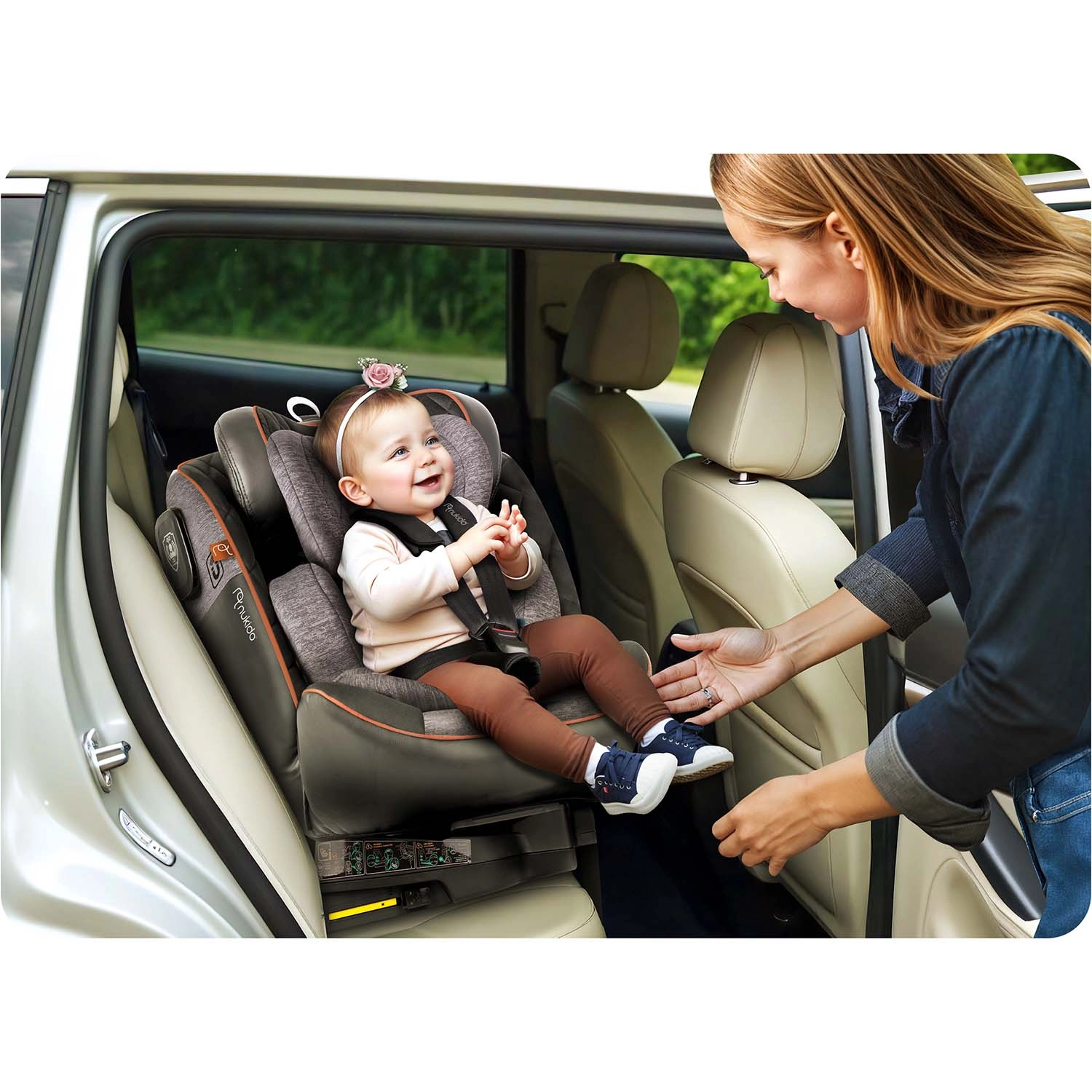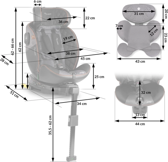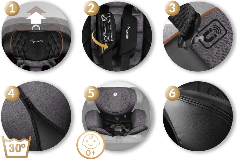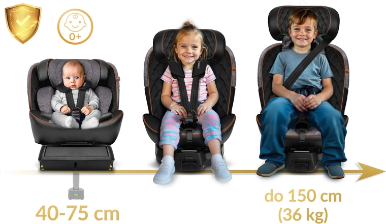 Pentru cei mai mici, servește centura de siguranță în 5 puncte și inserția ergonomică pentru nou-născuți. Pentru copiii mai mari, scaunul oferă ghidarea centurii auto prin 4 puncte de ancorare și adaptarea la creștere datorită celor 12 niveluri ale tetierei și înclinării în 5 trepte. Materialele premium, căptușeala moale matlasată și detaliile gândite inteligent (magnet pentru fixarea chingilor, protecții antiderapante) sporesc confortul și practicitatea zilnică.