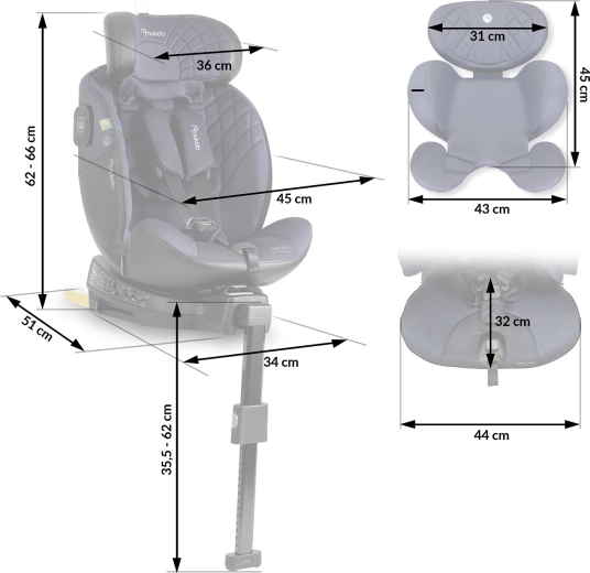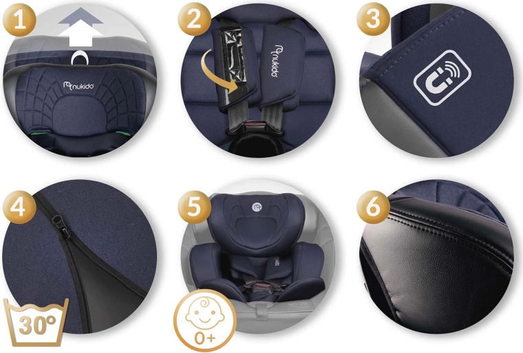 Scaunul auto Nukido Aero Line crește alături de copilul tău, de la naștere până în jurul vârstei de 12 ani. Conform ECE R129 (i-Size) îndeplinește cerințele europene stricte de siguranță, în timp ce ISOFIX și piciorul de sprijin asigură ancorarea fermă și corectă în automobil. Baza rotativă la 360° ușurează semnificativ manevrarea zilnică – așezarea și scoaterea copilului sunt rapide și comode.