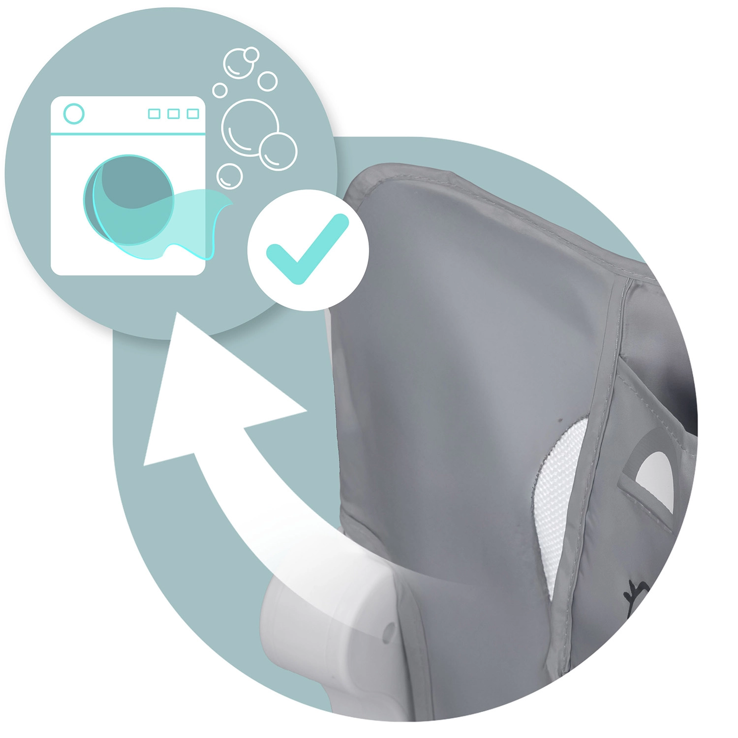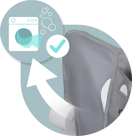 Panourile din plasă permit circulația aerului și supravegherea copilului. Husa se poate îndepărta ușor pentru spălare.
