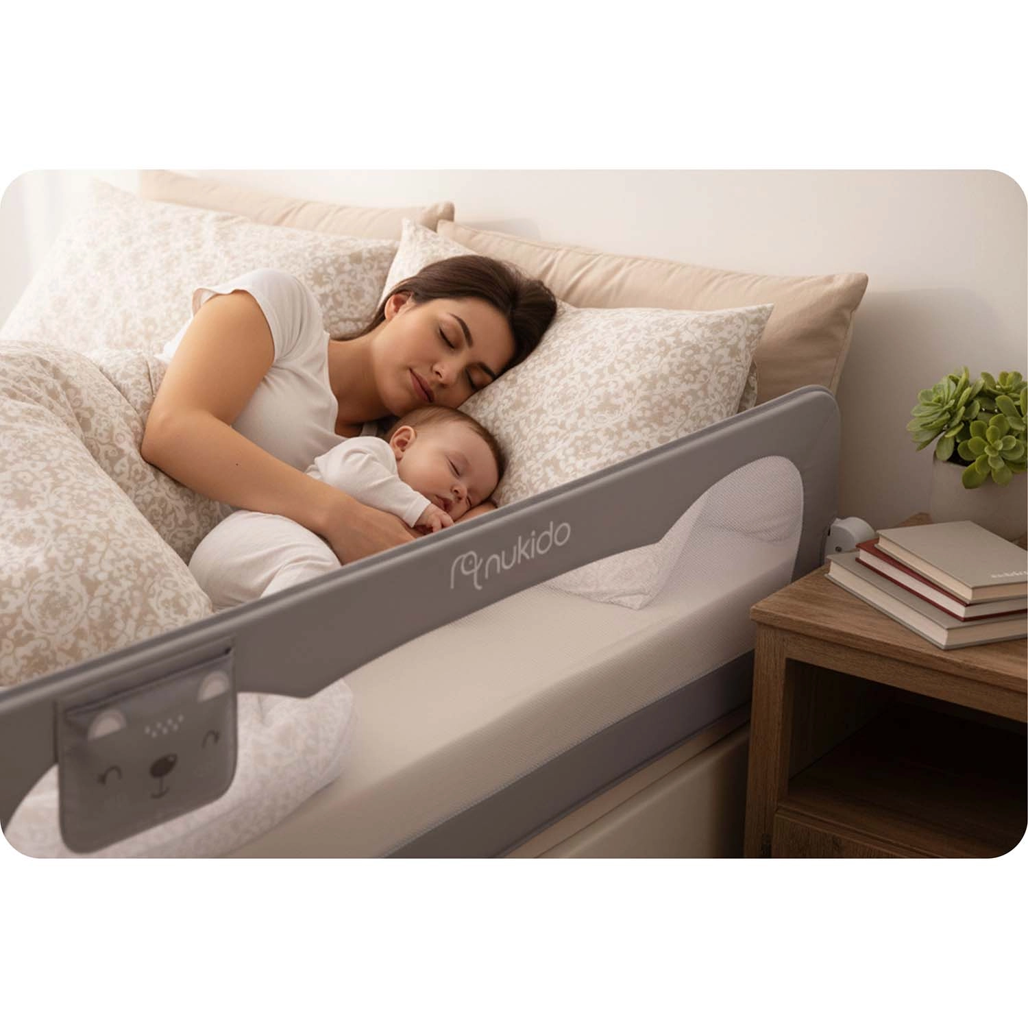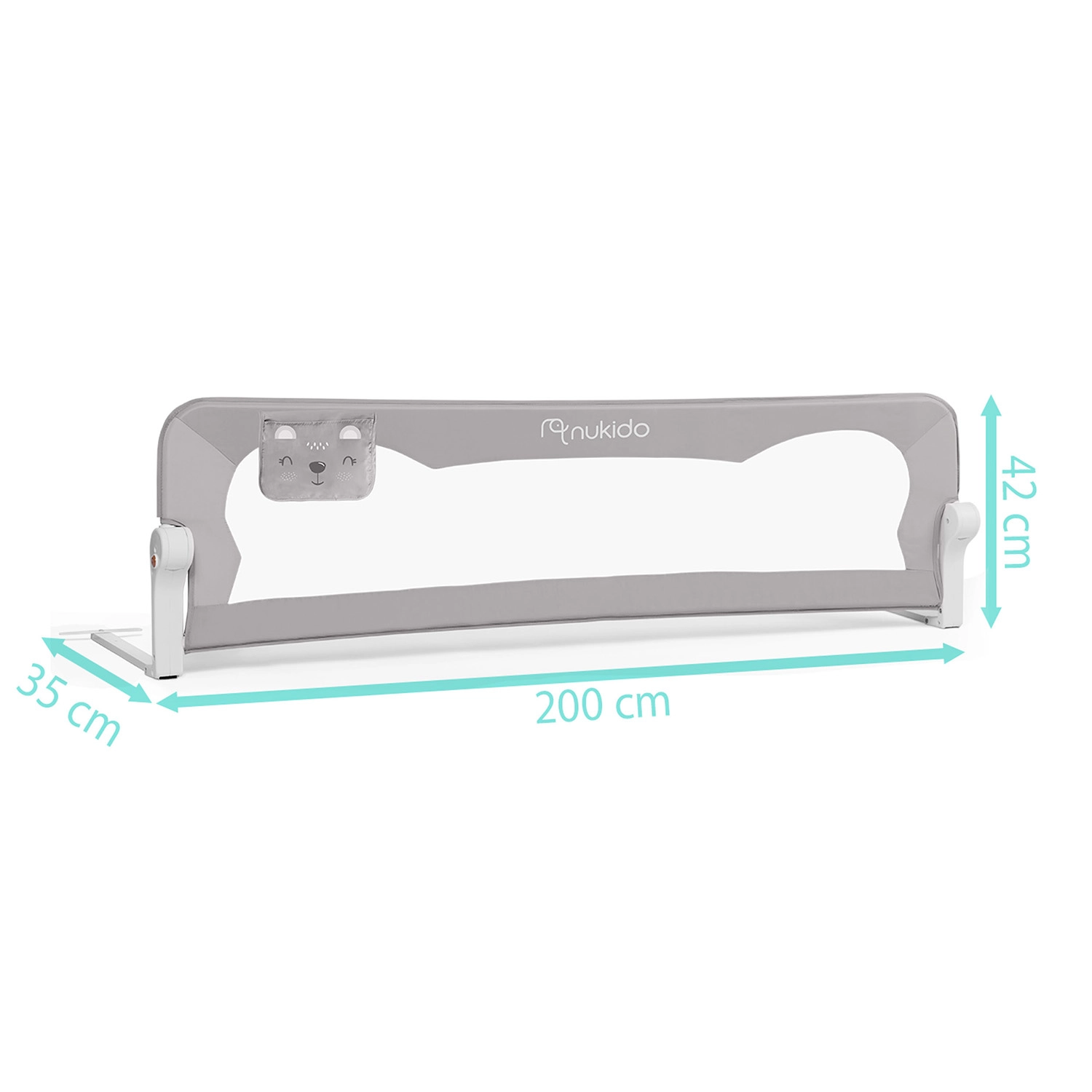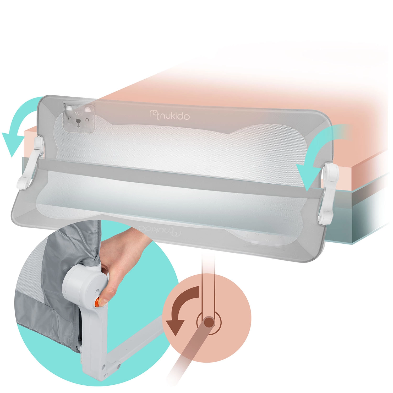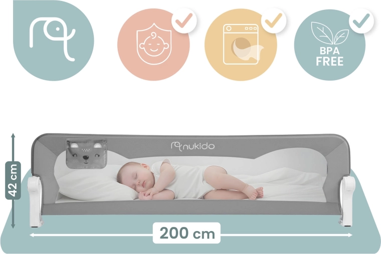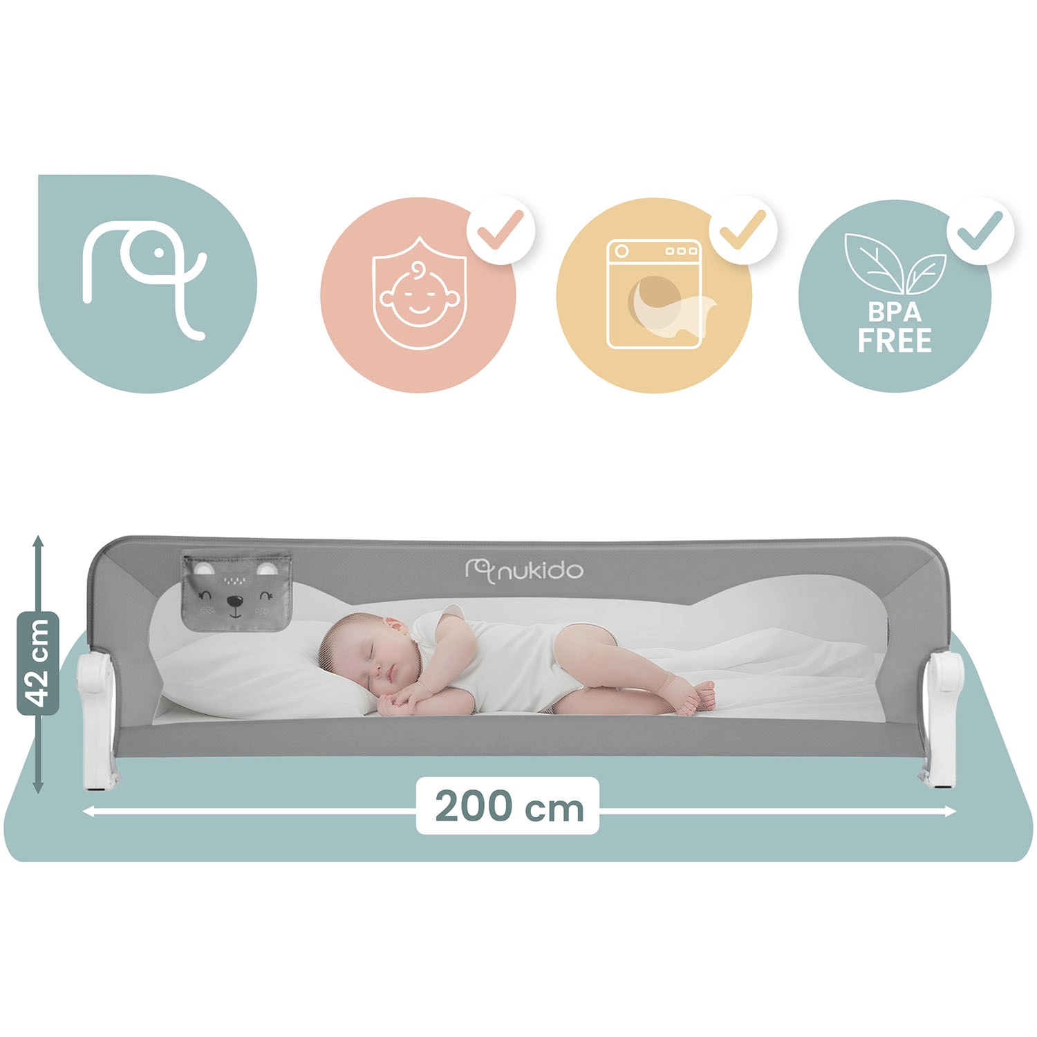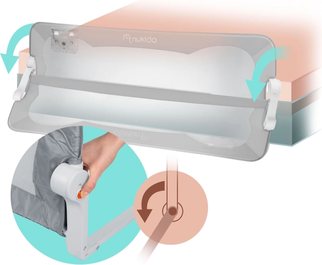 Bariera pentru pat Nukido 200 cm este o soluție practică și stilată pentru paturi mai mari și pentru somnul în familie. Rama ușoară, dar robustă din oțel, împreună cu plasa respirabilă, asigură stabilitate și, în același timp, permite contactul vizual cu copilul. Blocarea SafetyLock integrată protejează împotriva plierii accidentale, iar mecanismul pivotant la 180° permite rabatarea ușoară a barierei fără demontare.