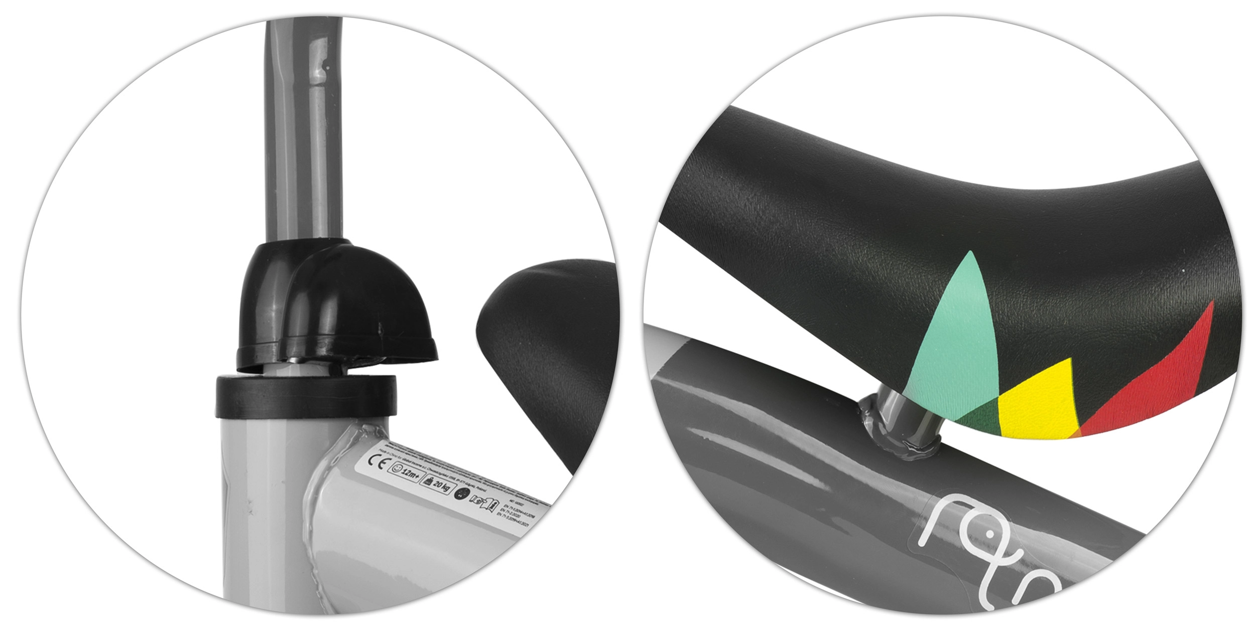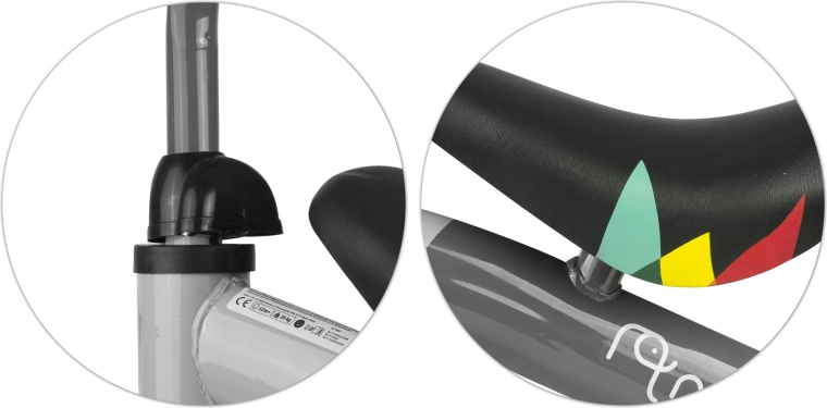 Șaua din spumă amortizează denivelările, iar mânerele cauciucate cu opritoare asigură o prindere sigură pentru mâinile mici.