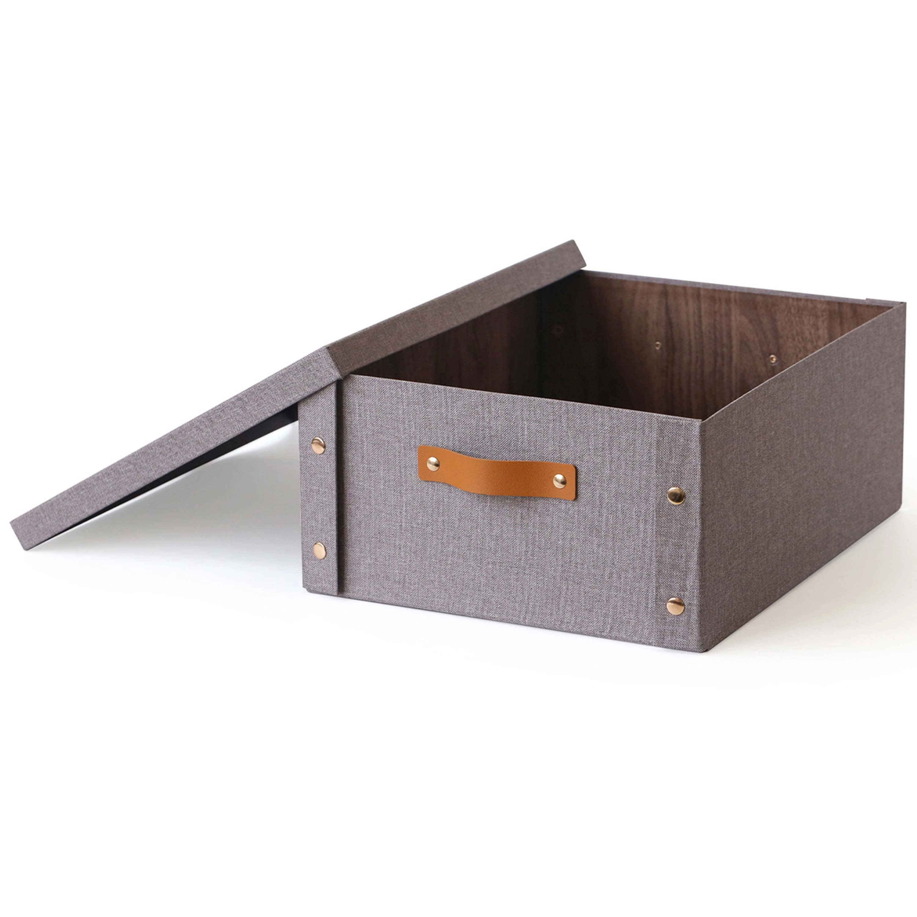 Această cutie de depozitare cu capac este o soluție excelentă pentru păstrarea documentelor, accesoriilor, jucăriilor sau textilelor. Combinația de hârtie și carton solid asigură stabilitate și greutate redusă, astfel încât se transportă ușor și își păstrează forma. Aspectul neutru se potrivește oricărui interior.