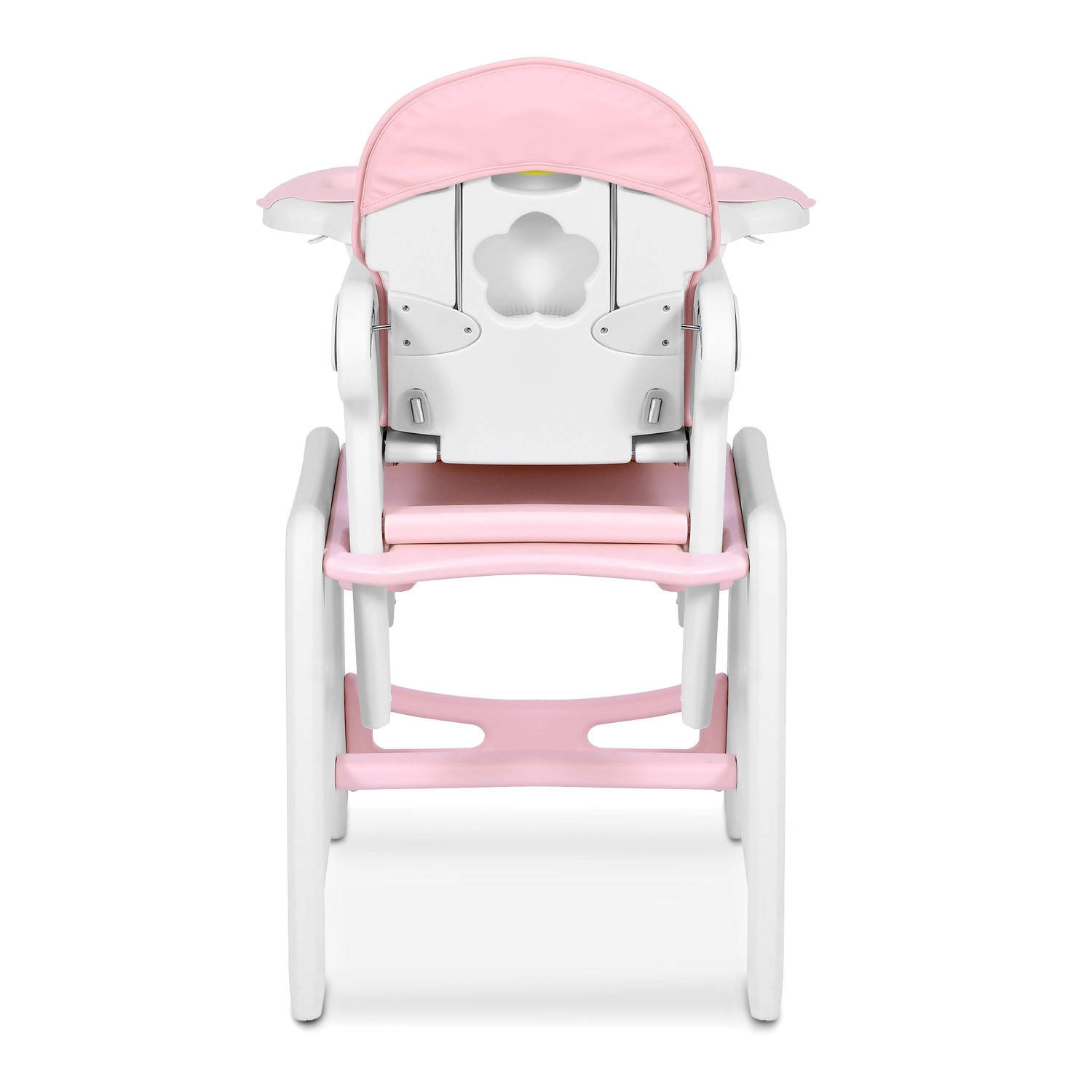 Pentru siguranță, are centuri de siguranță în 5 puncte și bază stabilă cu patru roți cu posibilitate de blocare. Spătar reglabil pe trei niveluri și reglarea înălțimii permit setarea poziției ideale pentru hrănire, joacă și odihnă. Tăvița detașabilă, cu margini ridicate și suport pentru cană, păstrează totul la locul său și ușurează întreținerea.