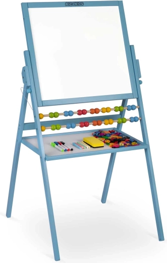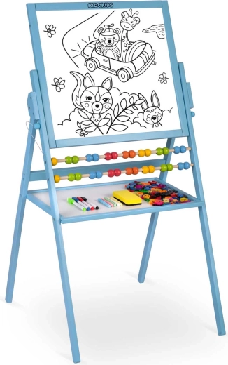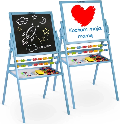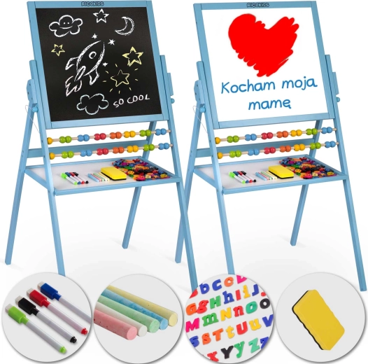 Mare, multifuncțională, tabla pentru copii de la RICOKIDS îmbină într-un singur cadru rotativ o parte pentru cretă și o parte magnetică albă. Datorită construcției stabile din lemn, abacului integrat și setului bogat de accesorii (creta, markere, burete, litere și cifre magnetice) susține creativitatea, învățarea și distracția – totul în siguranță și cu certificări CE, EN 71.