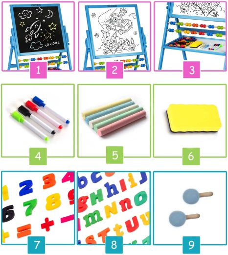 Face parte un abac colorat, care dezvoltă logica într-un mod distractiv și ajută la primele exerciții de calcul. Setul bogat de accesorii – markere, cretă, burete, litere și cifre magnetice – permite joacă și învățare imediată, fără achiziții suplimentare.